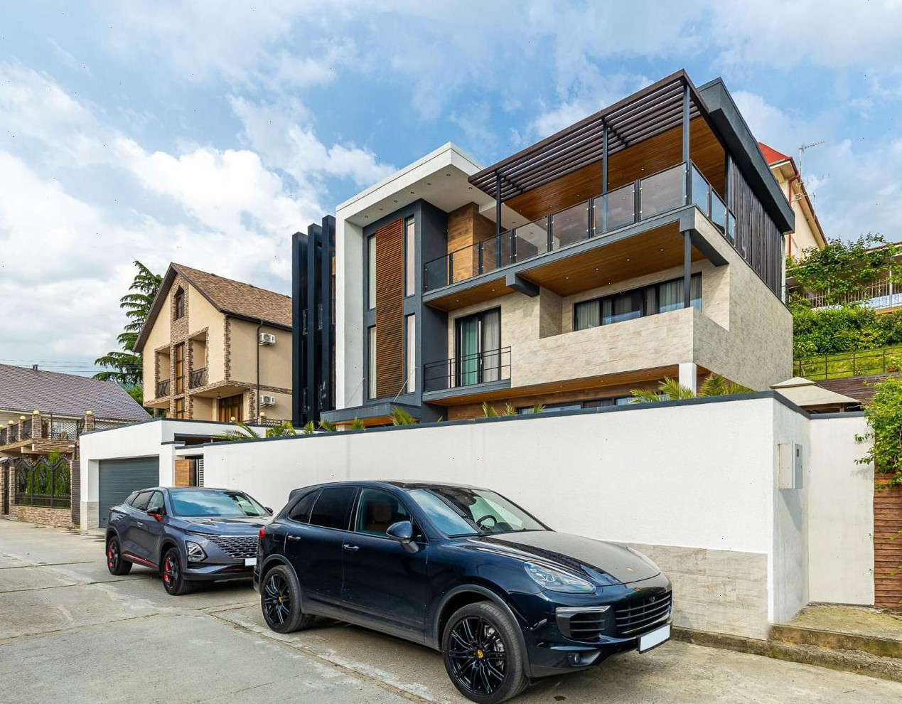 На нижнем уровне навес под два автомобиля.