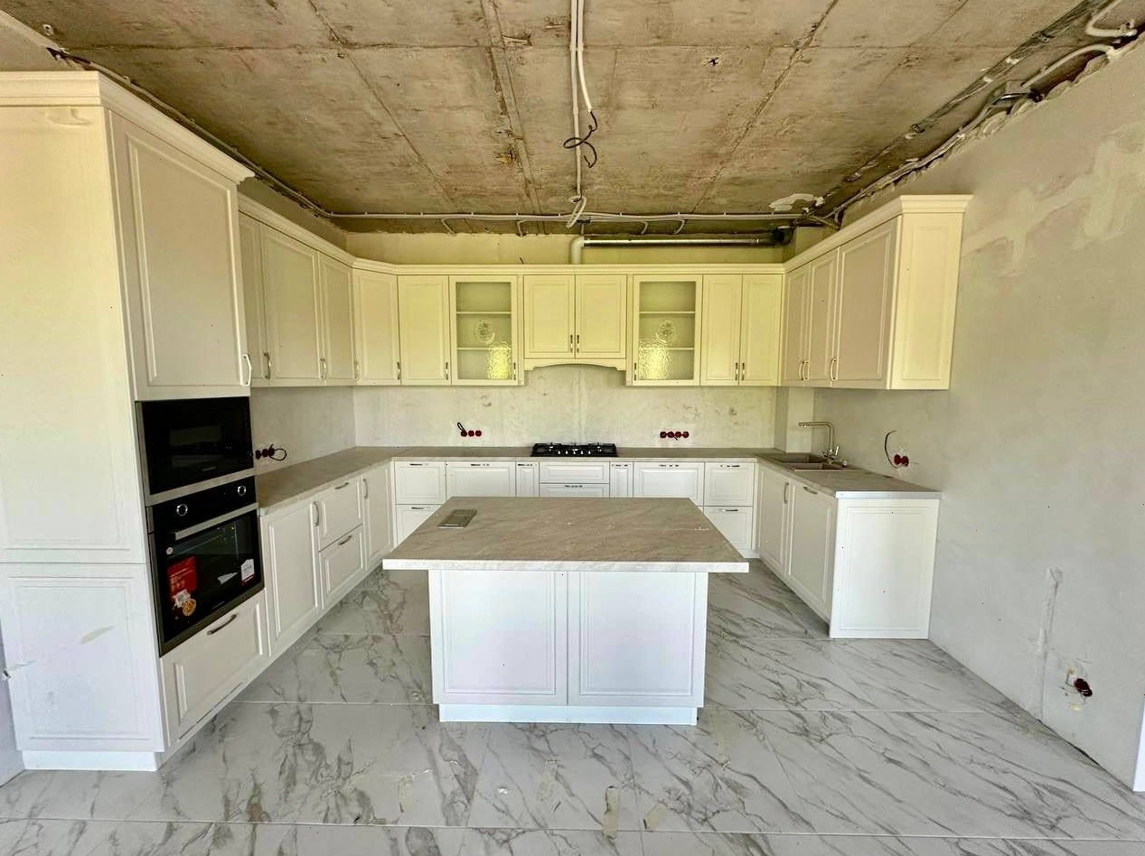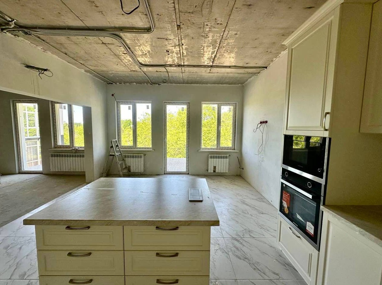 В доме чистовая отделка, во всех сан. узлах отделка готова, установлена кухня со всей встроенной техникой.