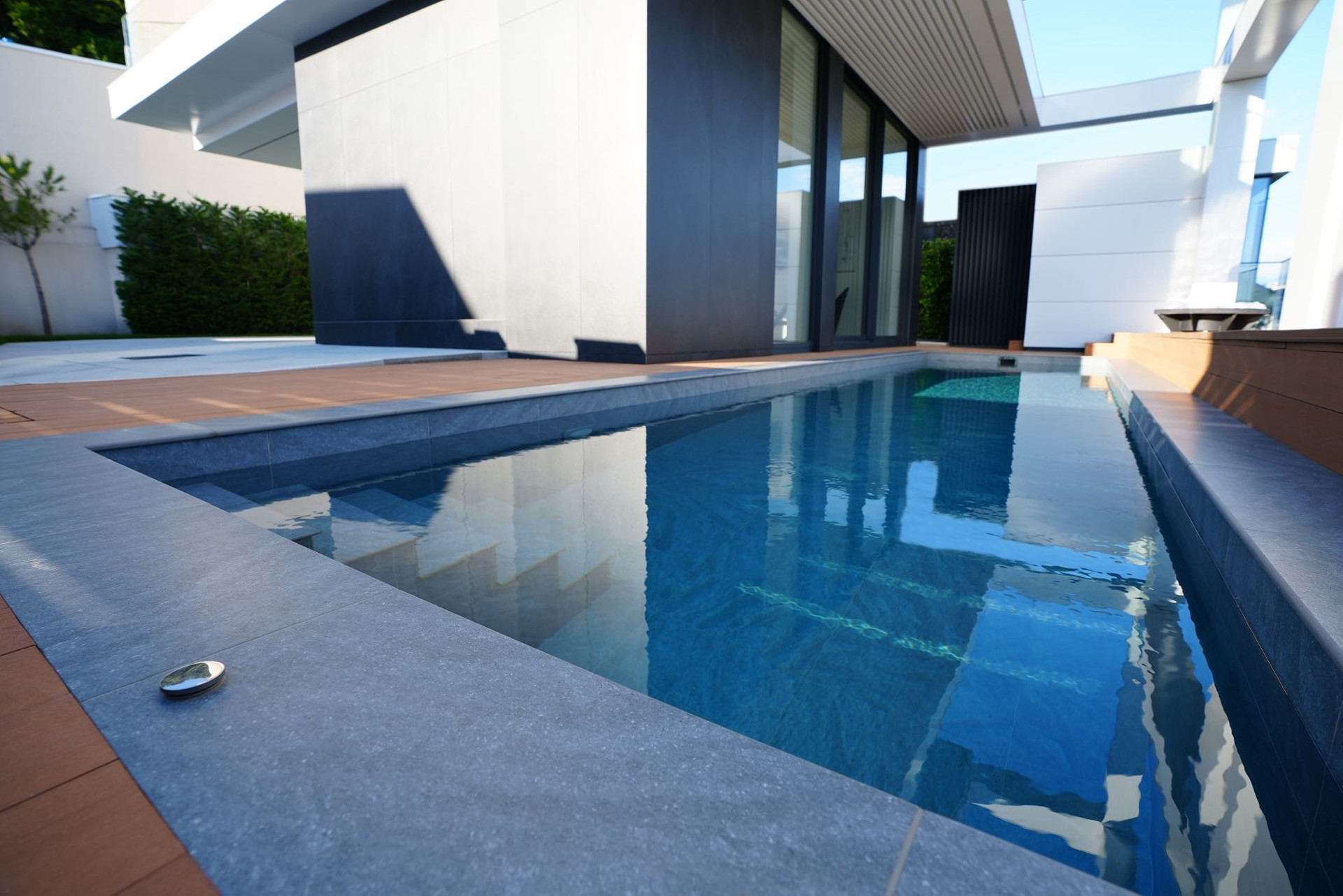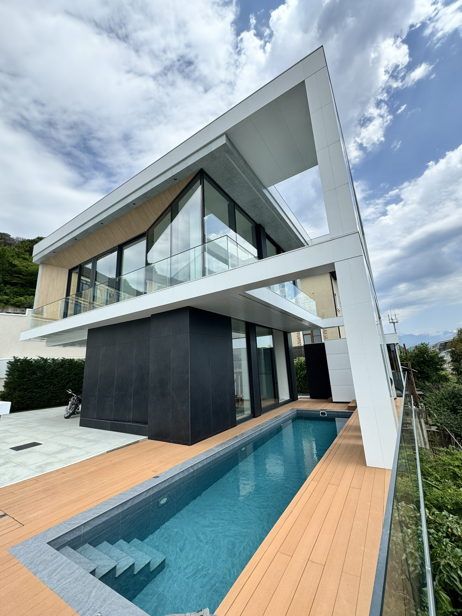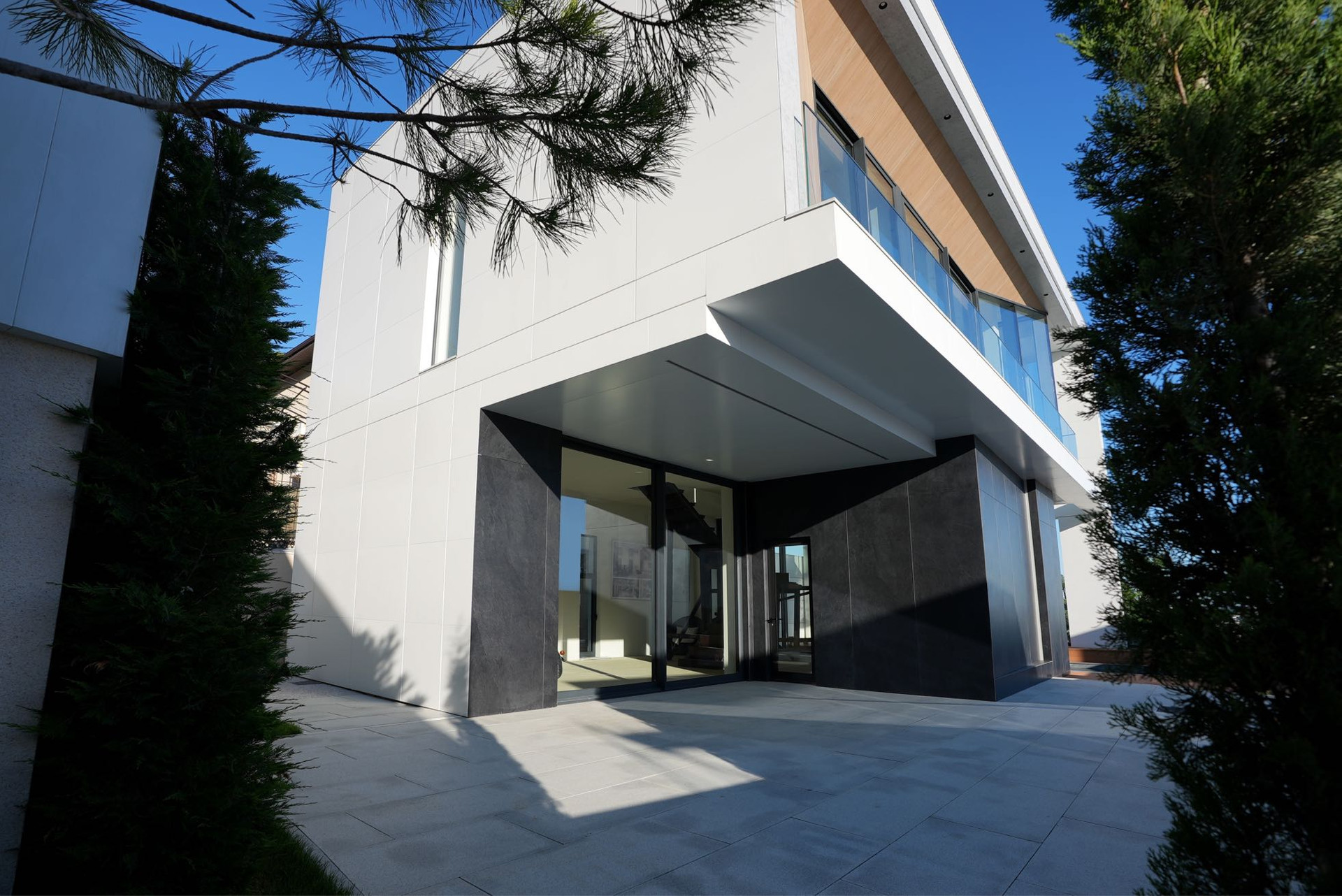 Фасад дома облицован крупноформатным Итальянским керамогранитом и алюминиевыми композитными панелями с утеплителем.