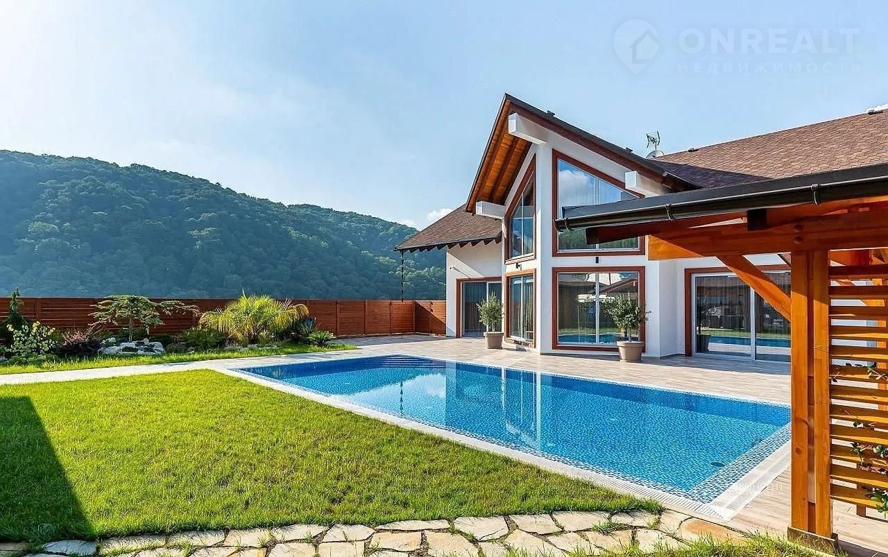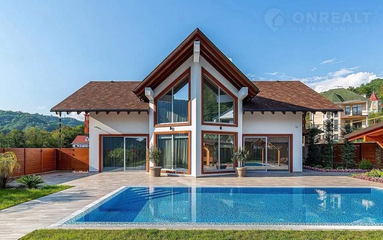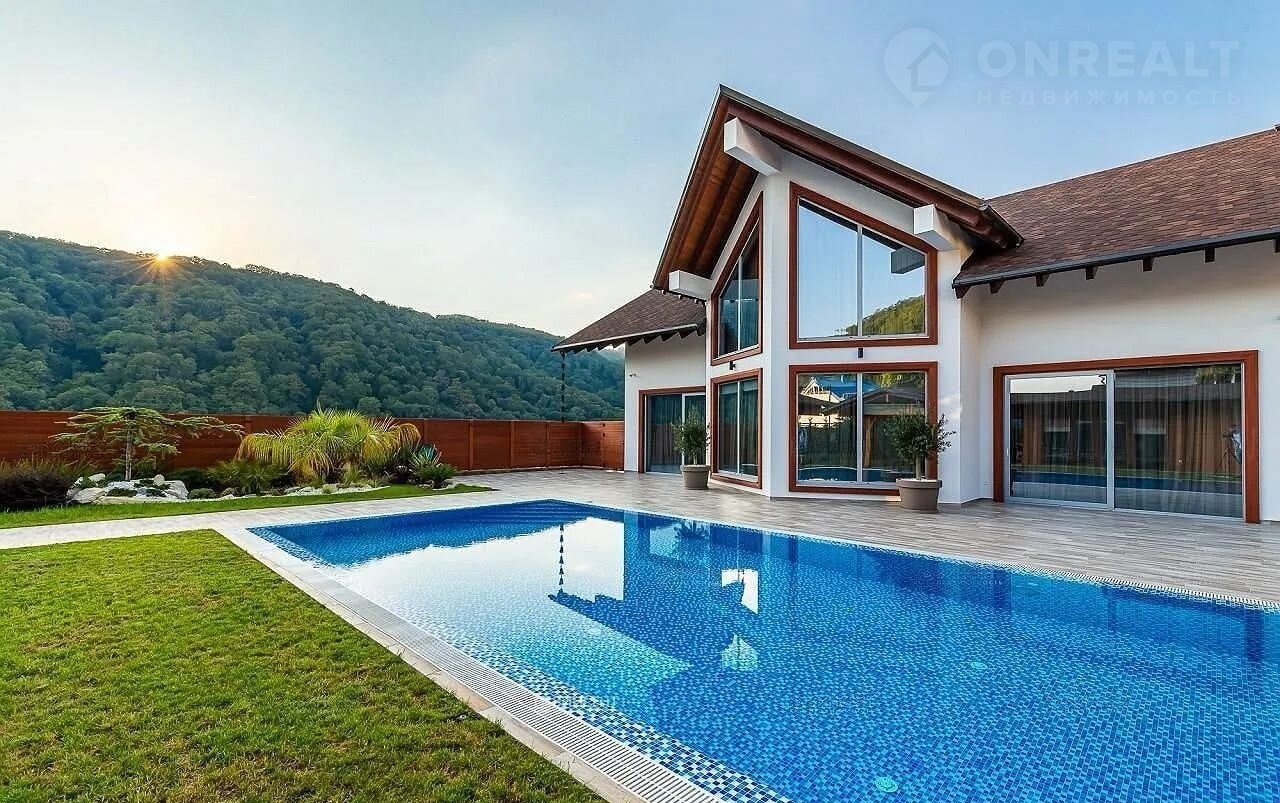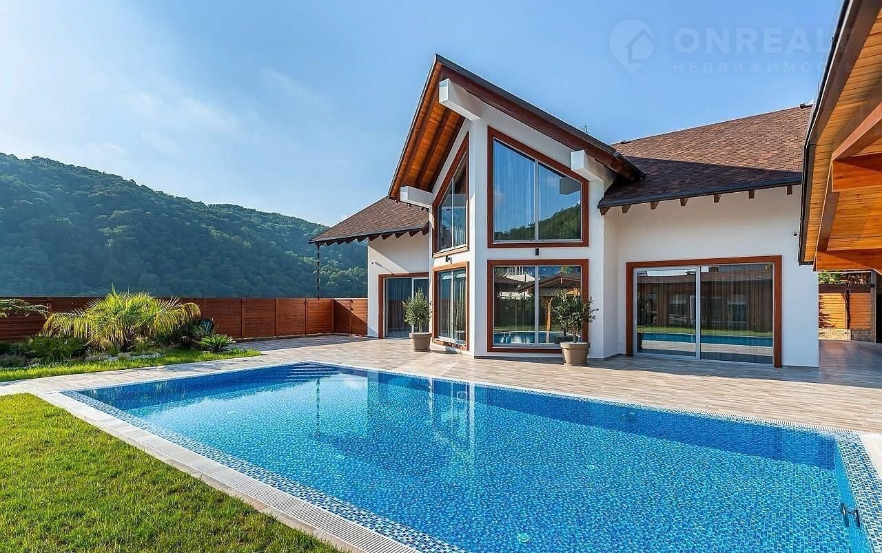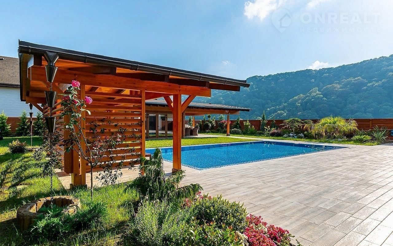 Но настоящая жемчужина этого дома – огромная терраса, где вас ждет собственный бассейн, утопающий в зелени.  Здесь, среди цветов и  уютных уголков,  можно наслаждаться отдыхом на свежем воздухе, любуясь красотой горных вершин. Зона барбекю, идеально оборудованная для незабываемых вечеров, и уютная баня добавят особый колорит вашей жизни.  Всё продумано до мелочей – здесь сочетаются роскошь, комфорт и умиротворение.