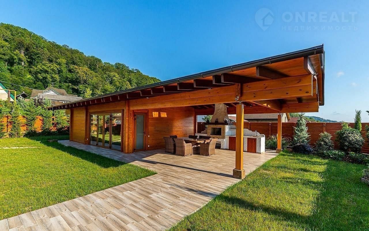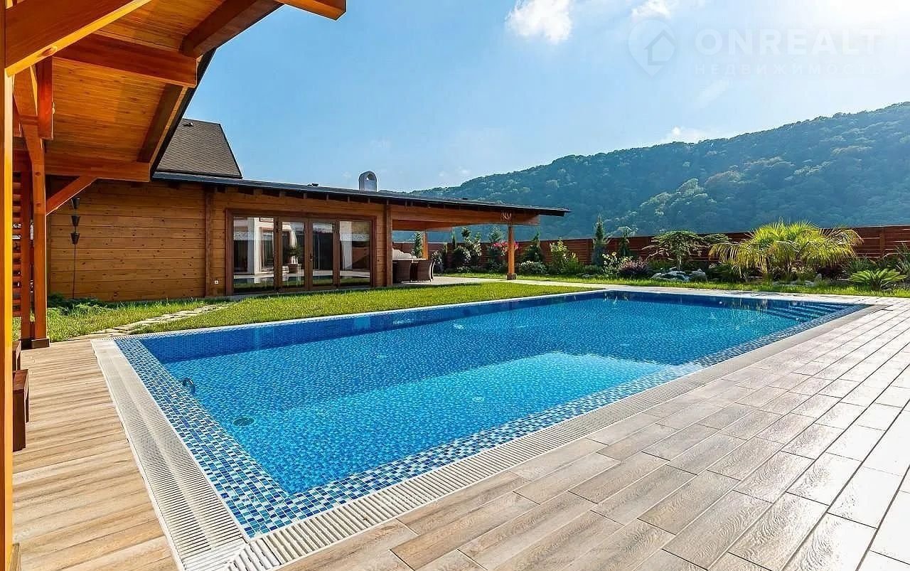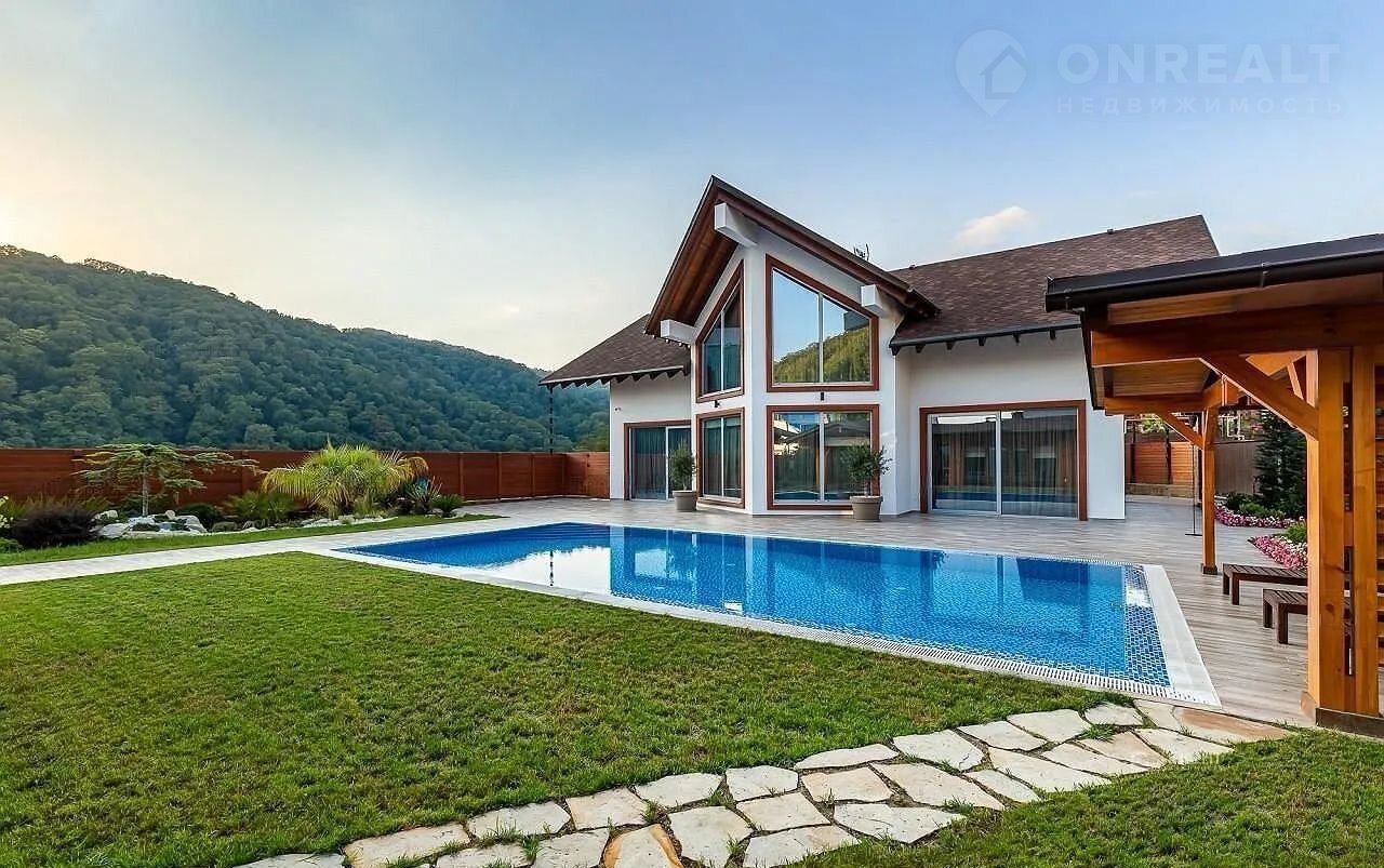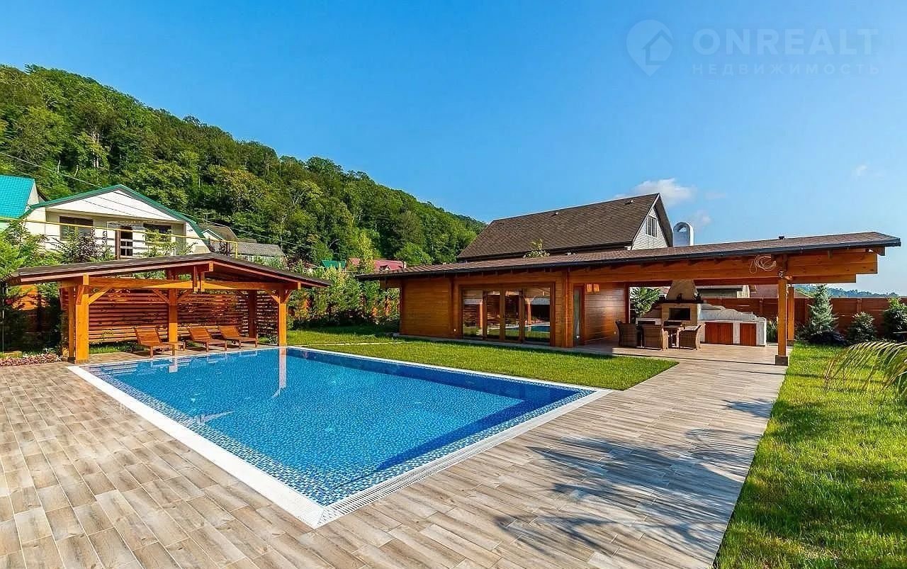 Но настоящая жемчужина этого дома – огромная терраса, где вас ждет собственный бассейн, утопающий в зелени.  Здесь, среди цветов и  уютных уголков,  можно наслаждаться отдыхом на свежем воздухе, любуясь красотой горных вершин. Зона барбекю, идеально оборудованная для незабываемых вечеров, и уютная баня добавят особый колорит вашей жизни.  Всё продумано до мелочей – здесь сочетаются роскошь, комфорт и умиротворение.