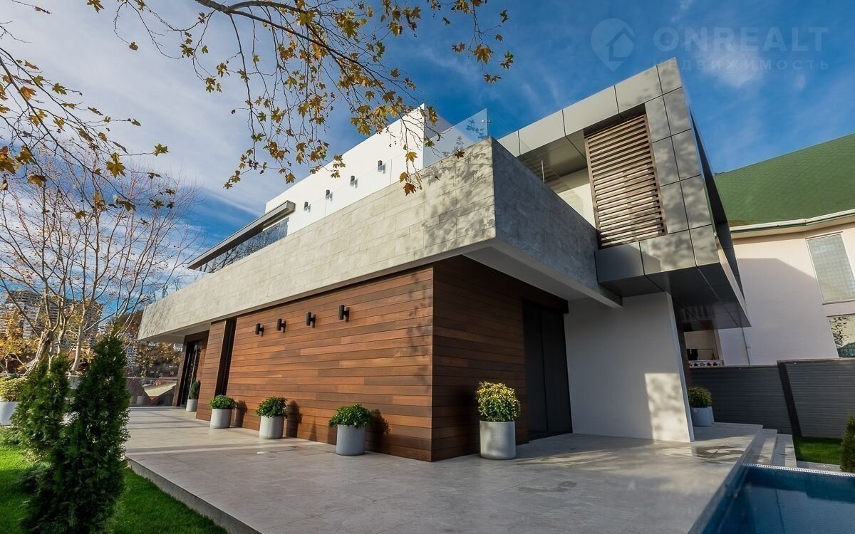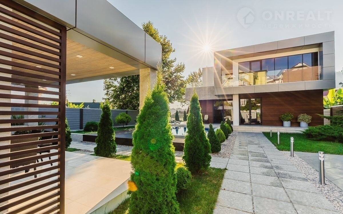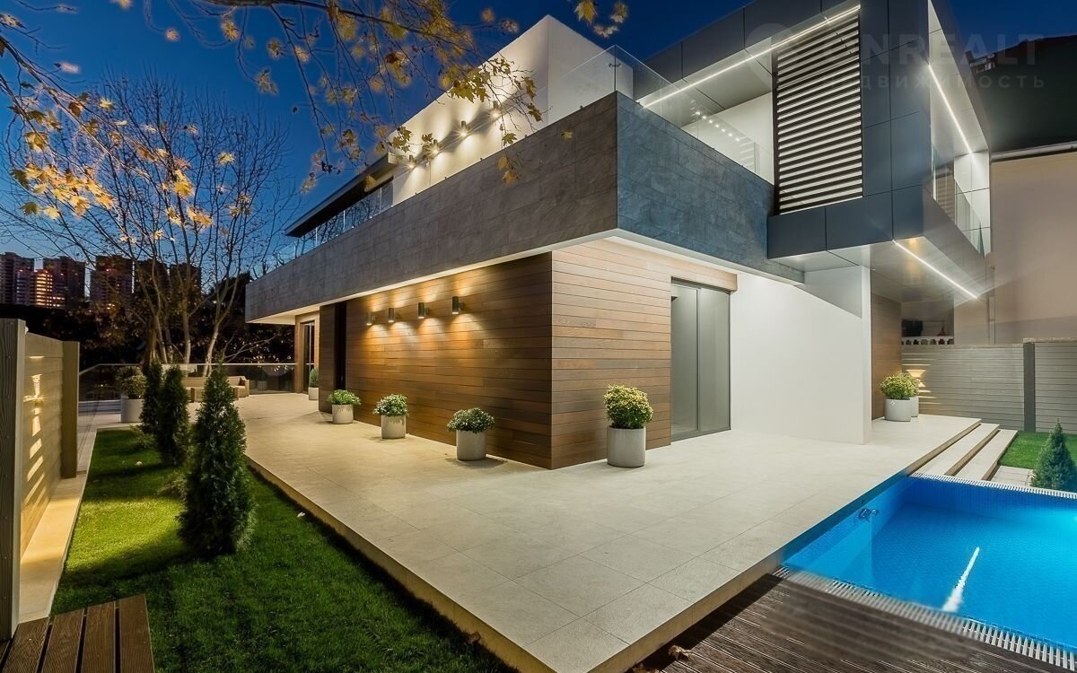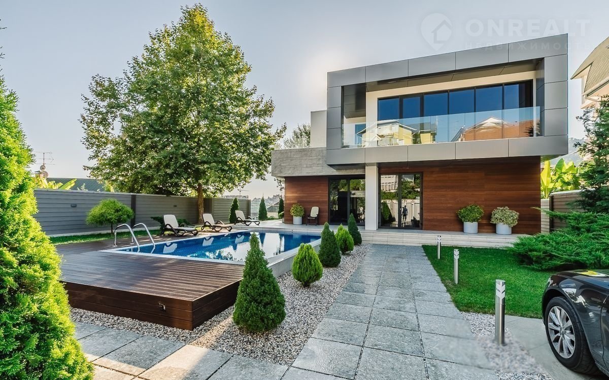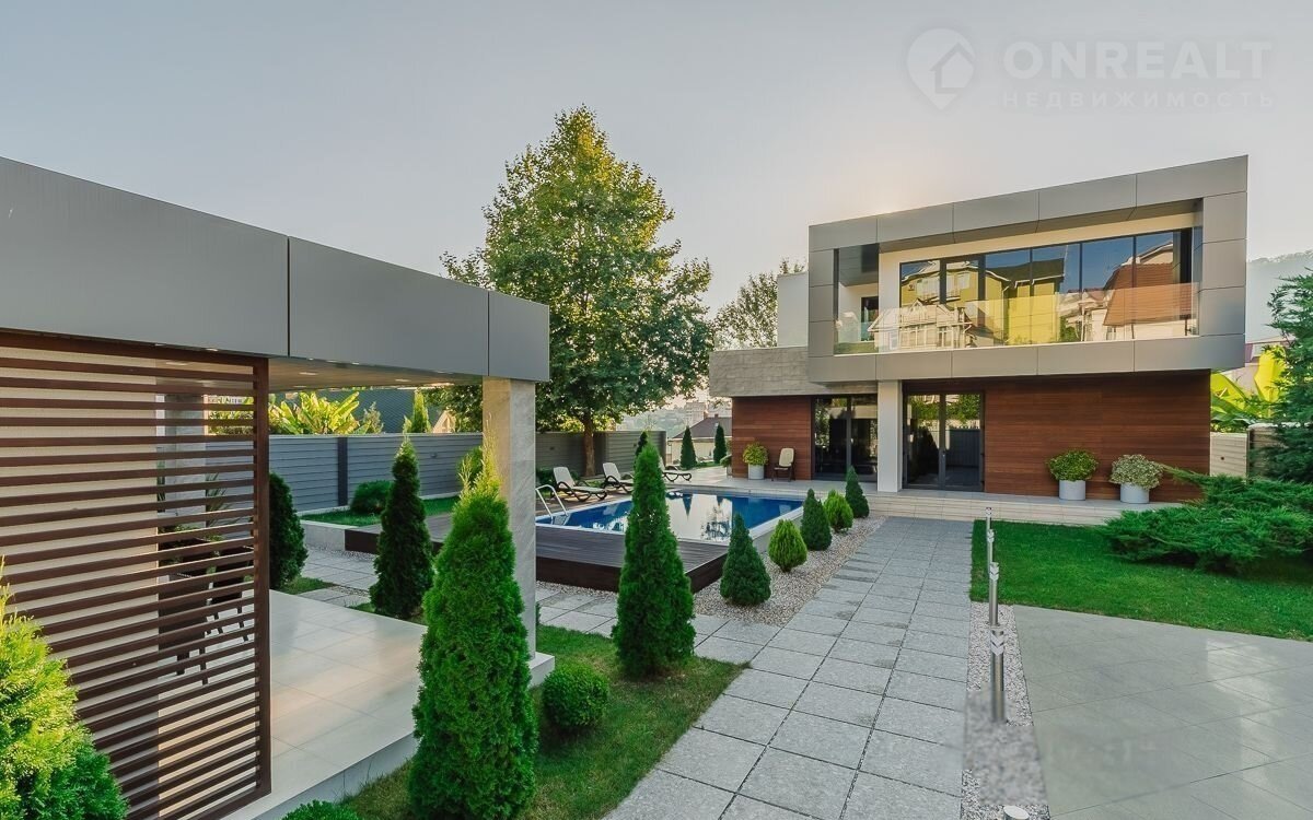 Панорамные окна, ландшафтное озеленение, бассейн, джакузи, сауна и стоянка на три автомобиля.
