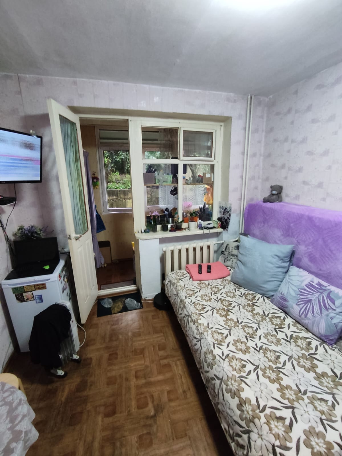 СРОЧНАЯ ПРОДАЖА Малосемейка. Голубые дали. Жилое состояние. В комнате установлена кухня с раковиной. унитаз. Секция чистая, не заставлена. Чисто. Проживает мало людей. С кухни балкон.
