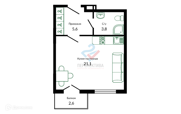 Жилая площадь 26.2 м2