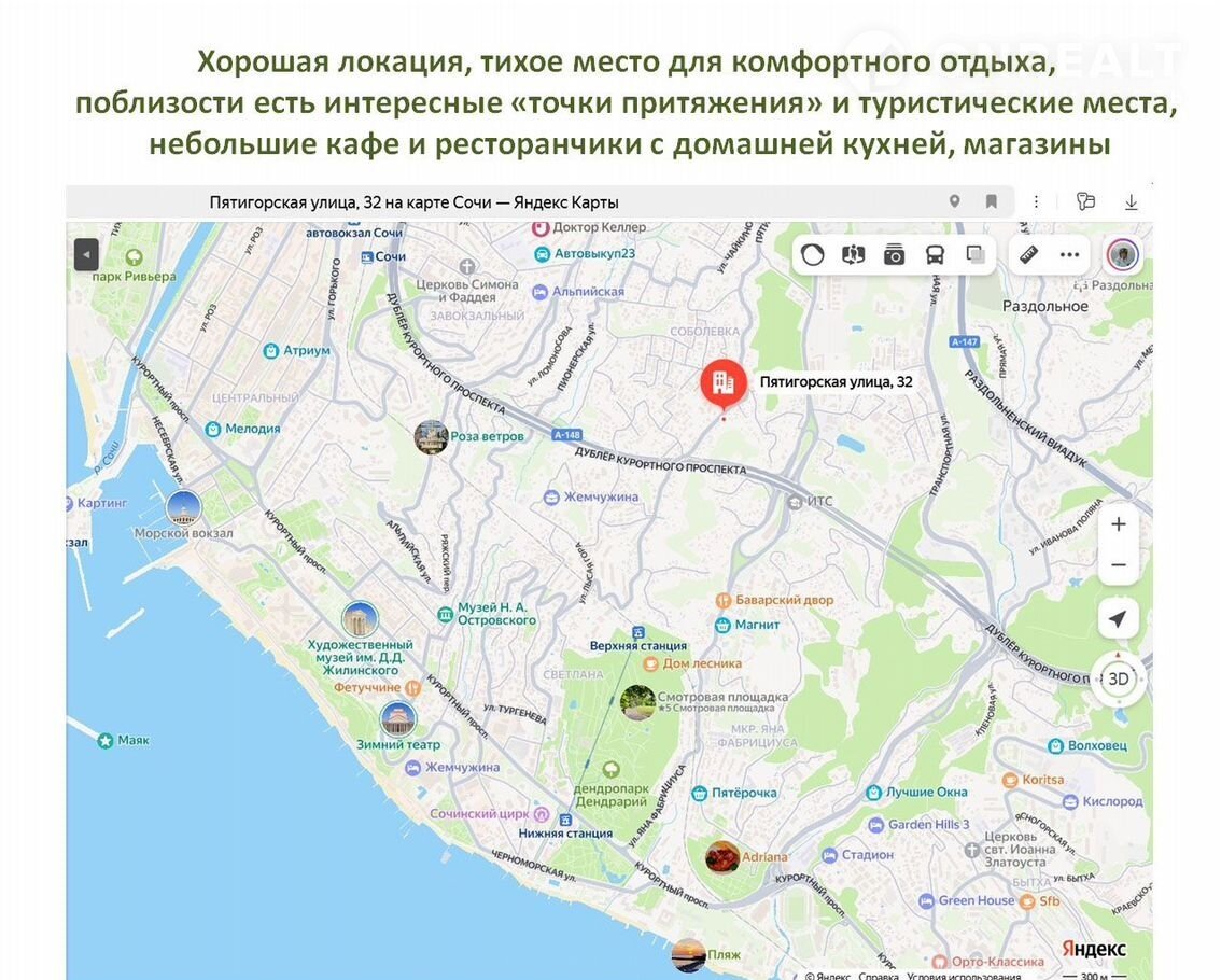 Локация - выше Светланы, микрорайон Соболевка. Хорош для спокойного времяпрепровождения и отдыха. Рядом есть домашний ресторанчик "Папа всех накормит", "Магнит", "Пятерочка", "КБ". До остановки автобуса 10 минут прогулочным шагом.