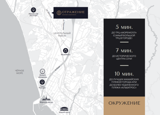 Комплекс расположен в центральном районе г. Сочи В 10 минутах езды от лучших пляжей, центральной Набережной, Морского порта, парка Ривьера, прогулочных скверов, и всех достопримечательностей города. В пешей доступности школы, сады, ТЦ Море Молл, кафе, гипермаркет. На территории расположены спортивные и детские площадки, кафе, различные магазины, фитне... |