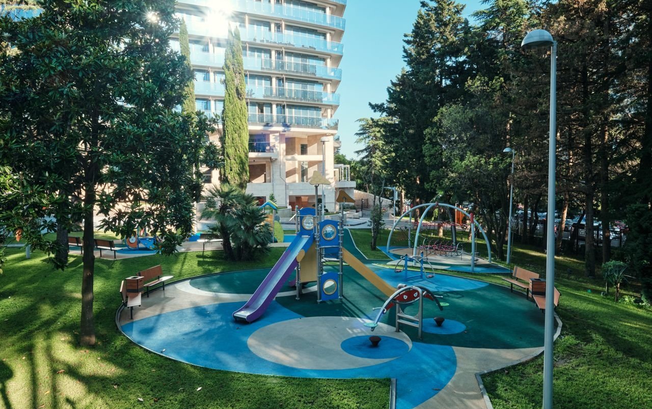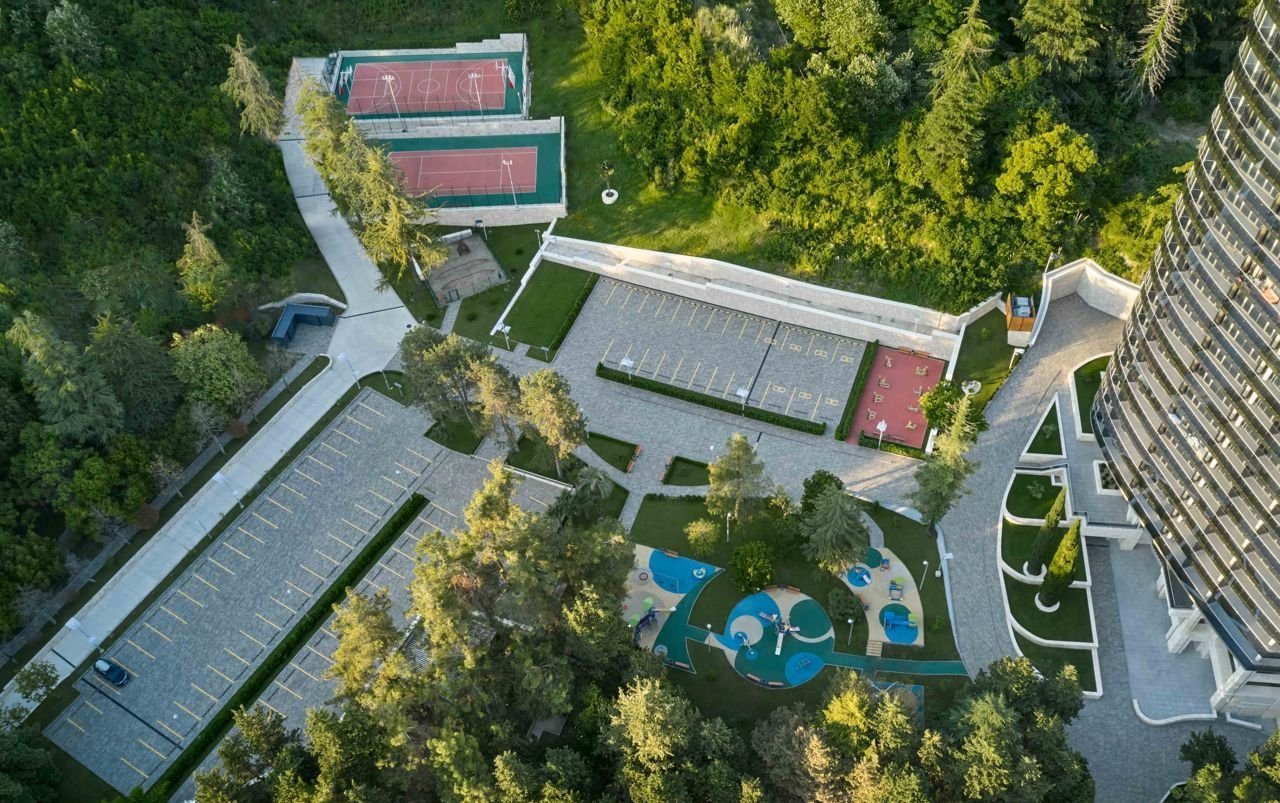 Собственная территория комплекса составляет 2,2 гектара. Большую часть занимает реликтовый сад, в который органично вписаны детские и спортивные площадки, зоны отдыха и пространство для выгула домашних питомцев. Доступен приватный пляж.