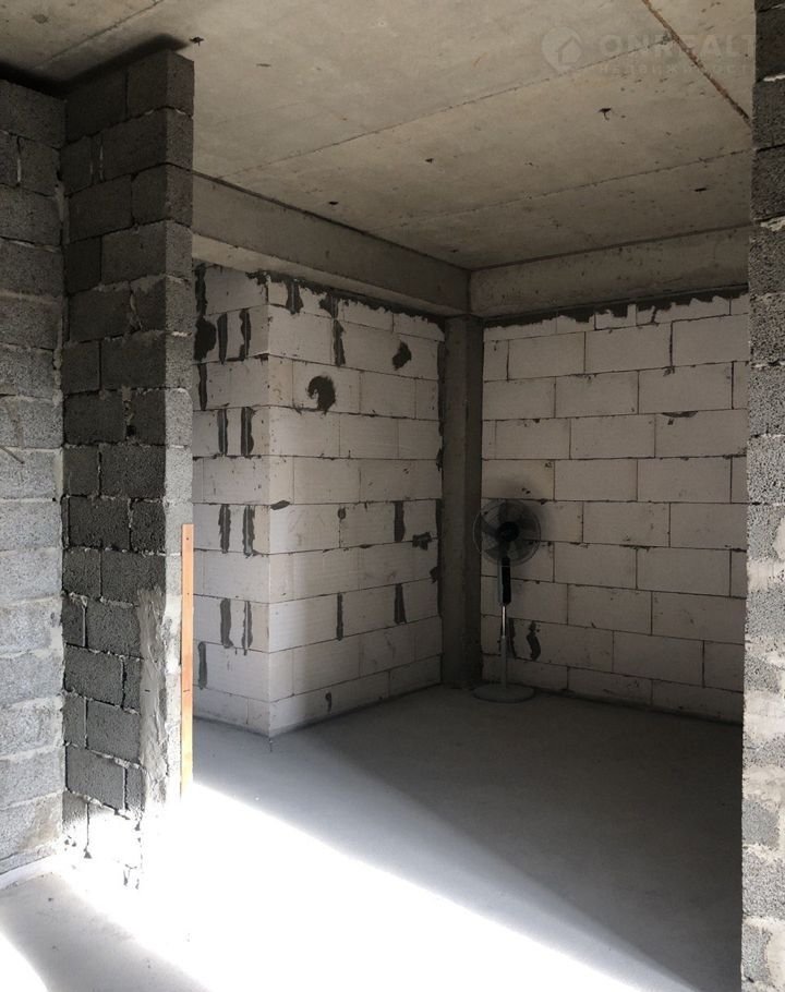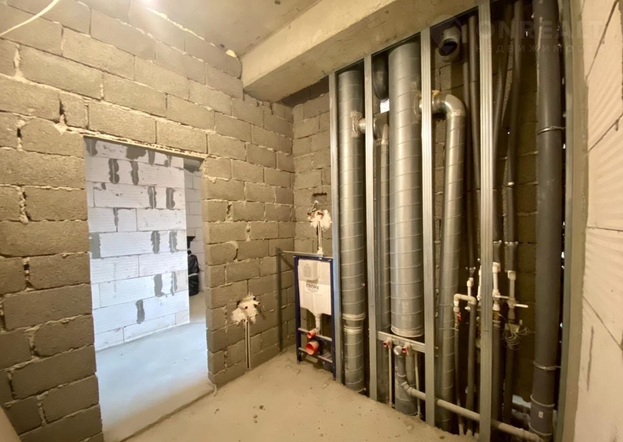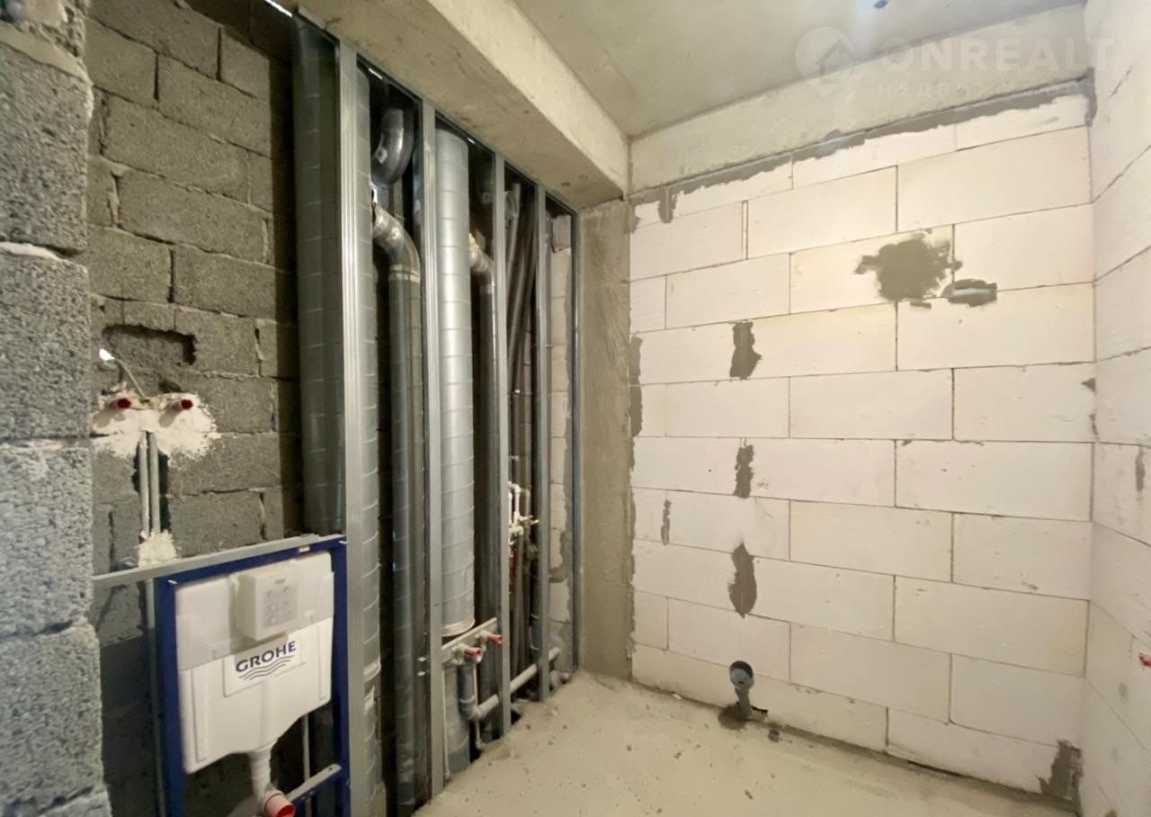 Стоит инсталляция для сантехники, установлена трасса для кондиционера, проведена частичная сантехника, сделана стяжка полов.