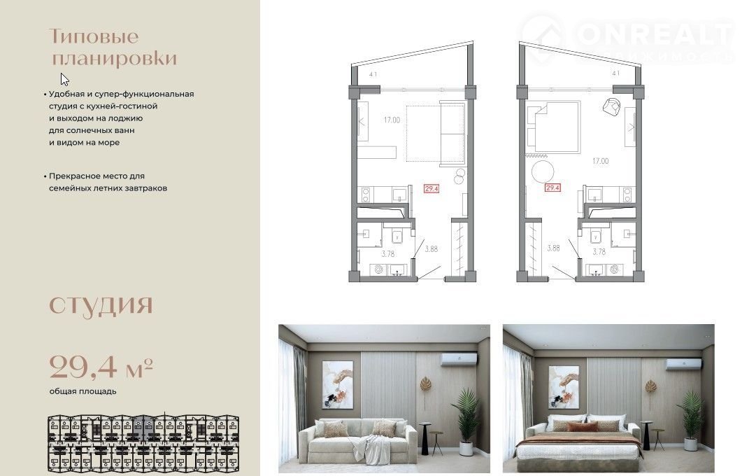 Квартира студия, 29.4 м2, этаж 7 / 11, на продажу в Сочи