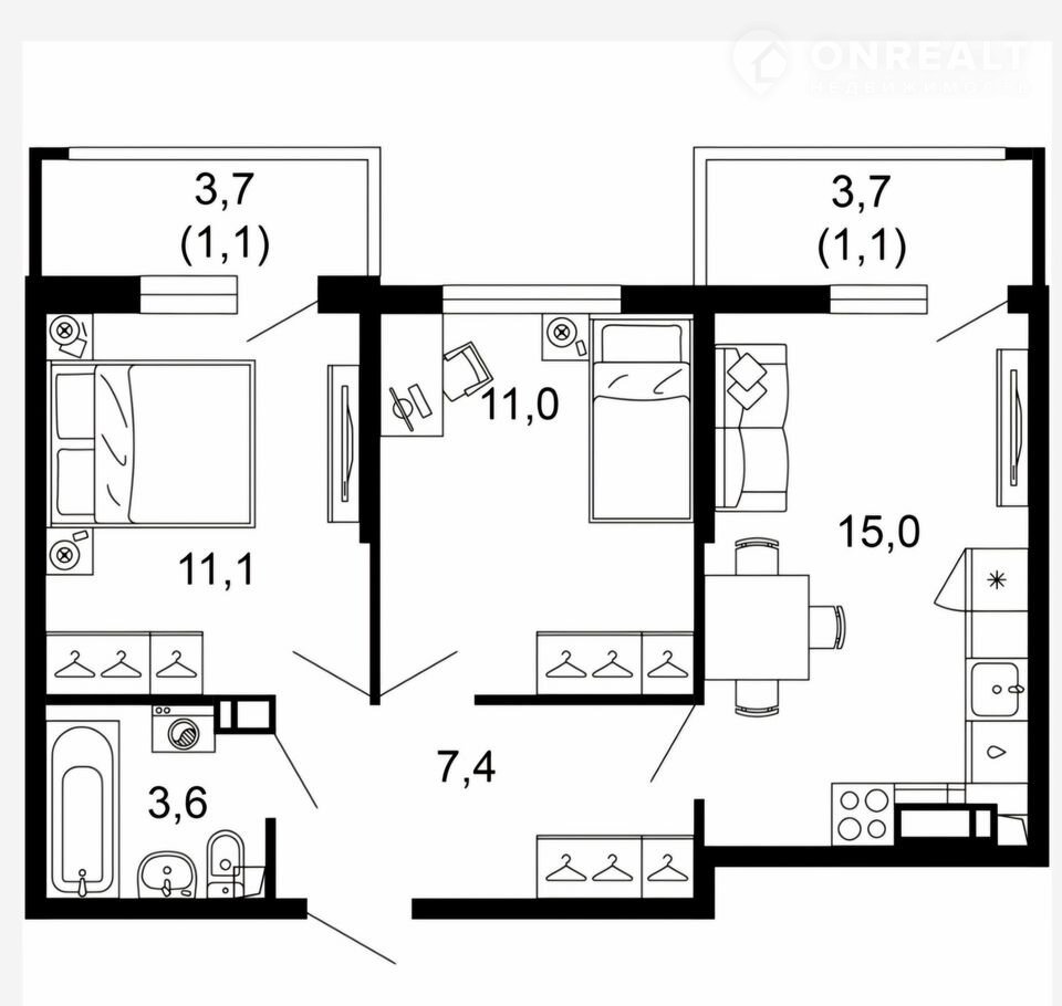 Жилая площадь 22.1 м2