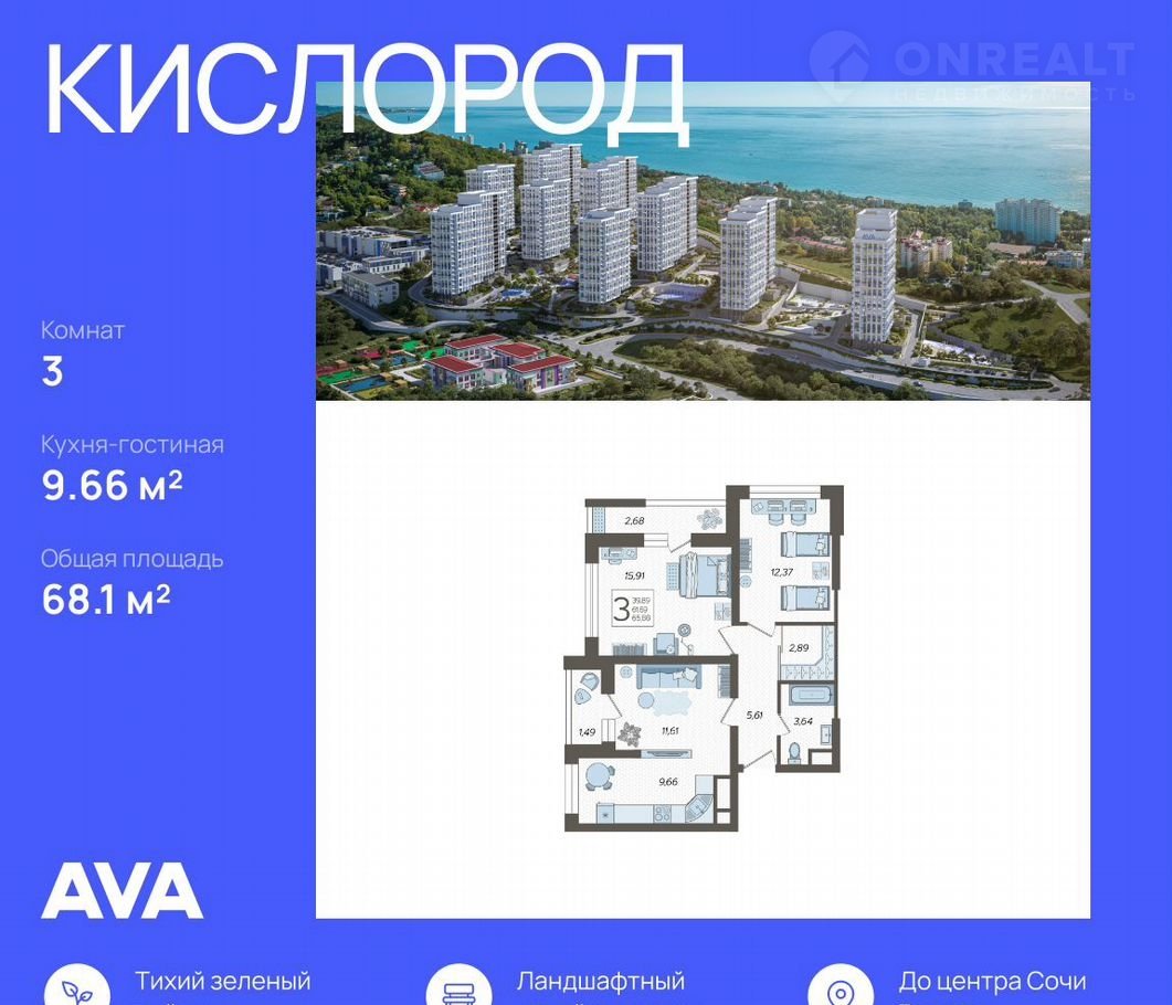 3-комнатная квартира, 68.1 м2, этаж 3 / 19, на продажу в Сочи, Ясногорская улица, 16/2к1
