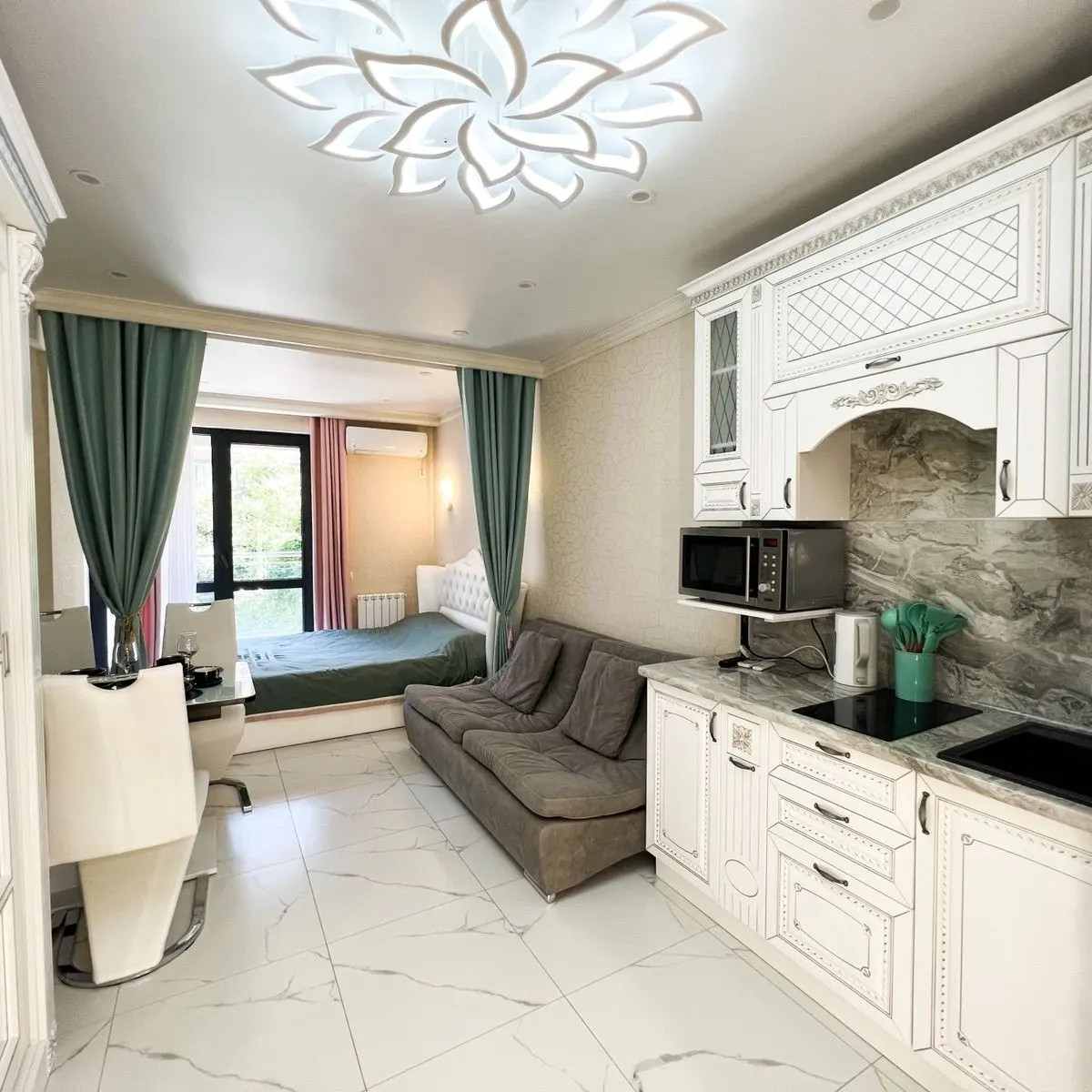 В квартире сделан дорогой дизайнерский ремонт, дорогая техника Haier , мебель, шикарная кровать KING SIZE, дизайнерские стулья BARLO , удобный диван - кровать, профессиональное зеркало с освещением, кондиционер, тёплый пол, центральное отопление, умный свет, люстра LED, по всей студии цветные лампы RGB, все с пультом управления, розетки с выходом USB, сенсорные выключатели, полноценная ванная с многофункциональной душевой панелью, полотенцесушитель с таймером и терморегулятором, подвесной унитаз с инсталляцией, панорамные окна, балкон!