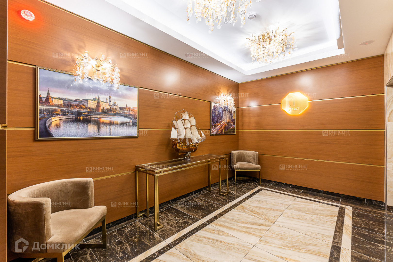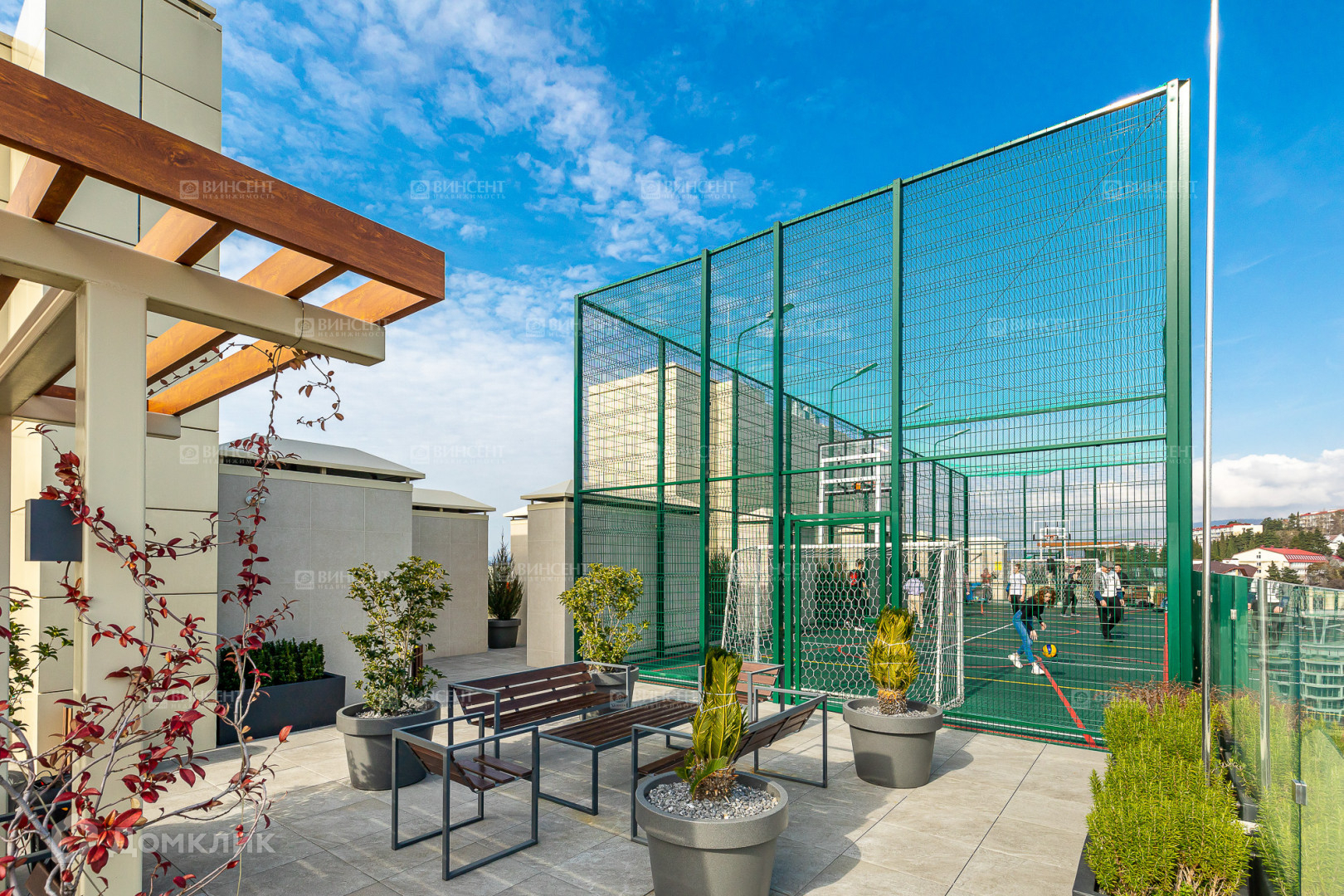 Территория комплекса, в состав которого входит данная квартира, полностью закрыта для посторонних. Есть игровые и спортивные площадки, а на эксплуатируемой кровле находится собственный бассейн. В холле на первом этаже – лобби-бар и стойка специалистов консьерж-сервиса.