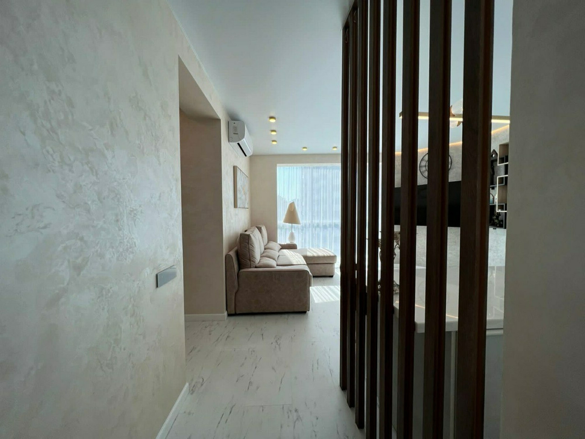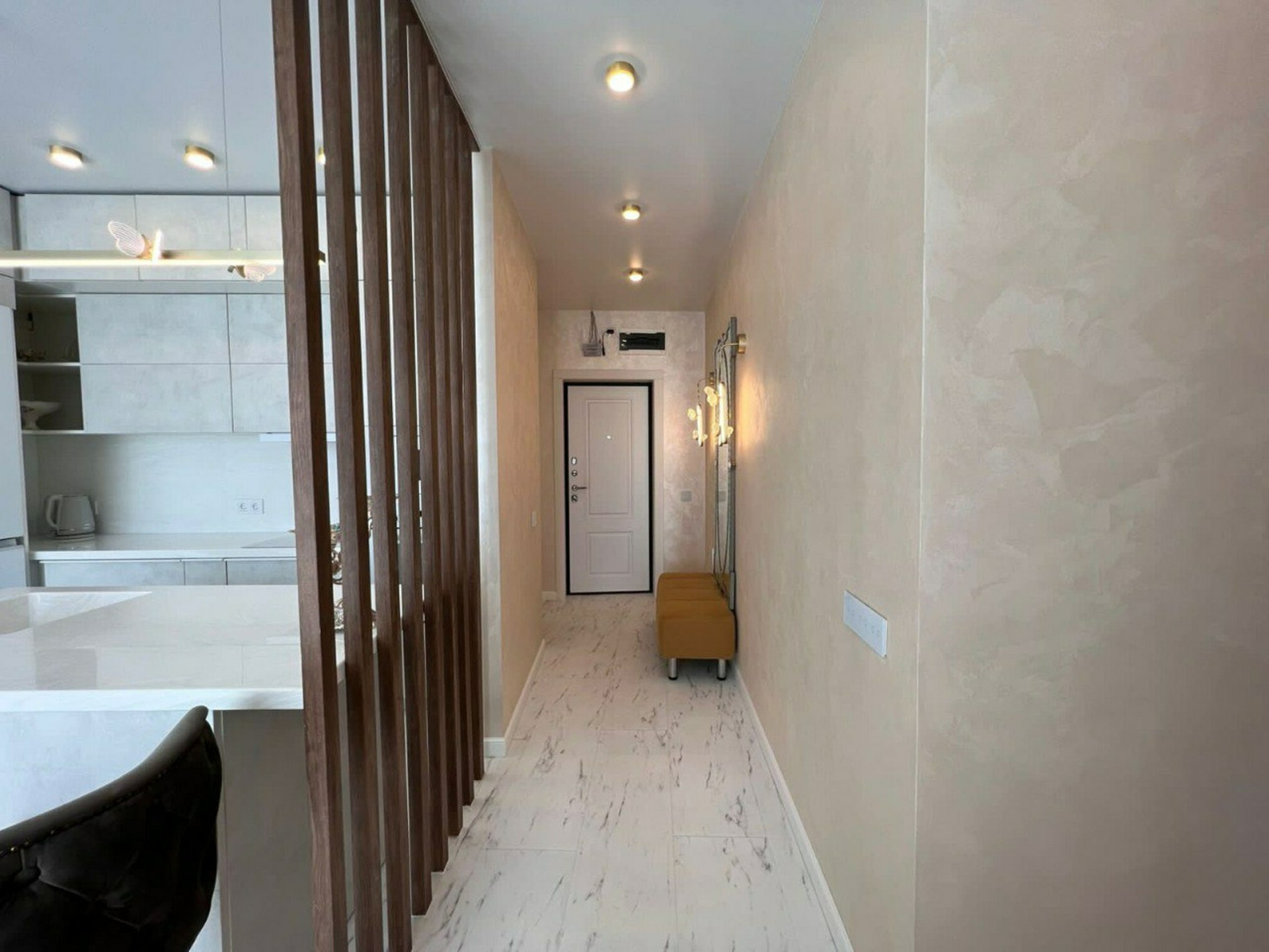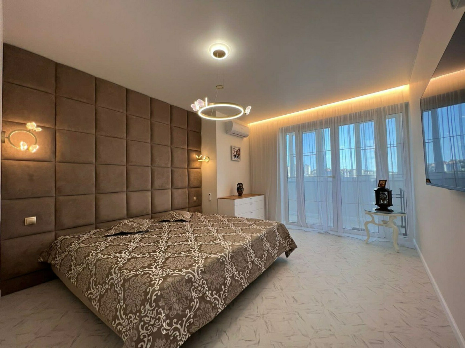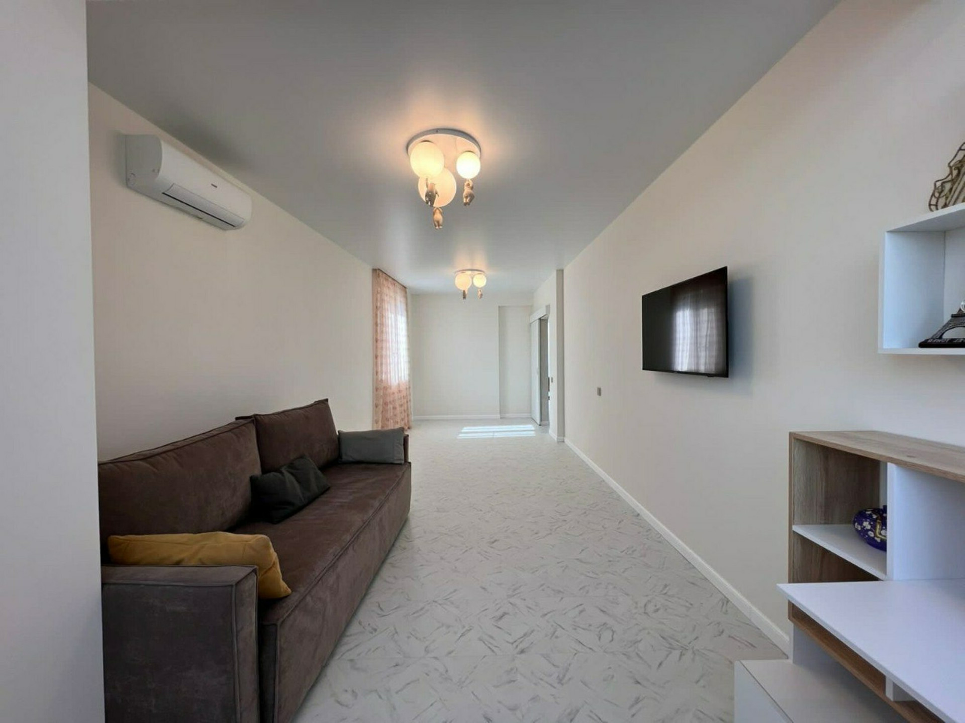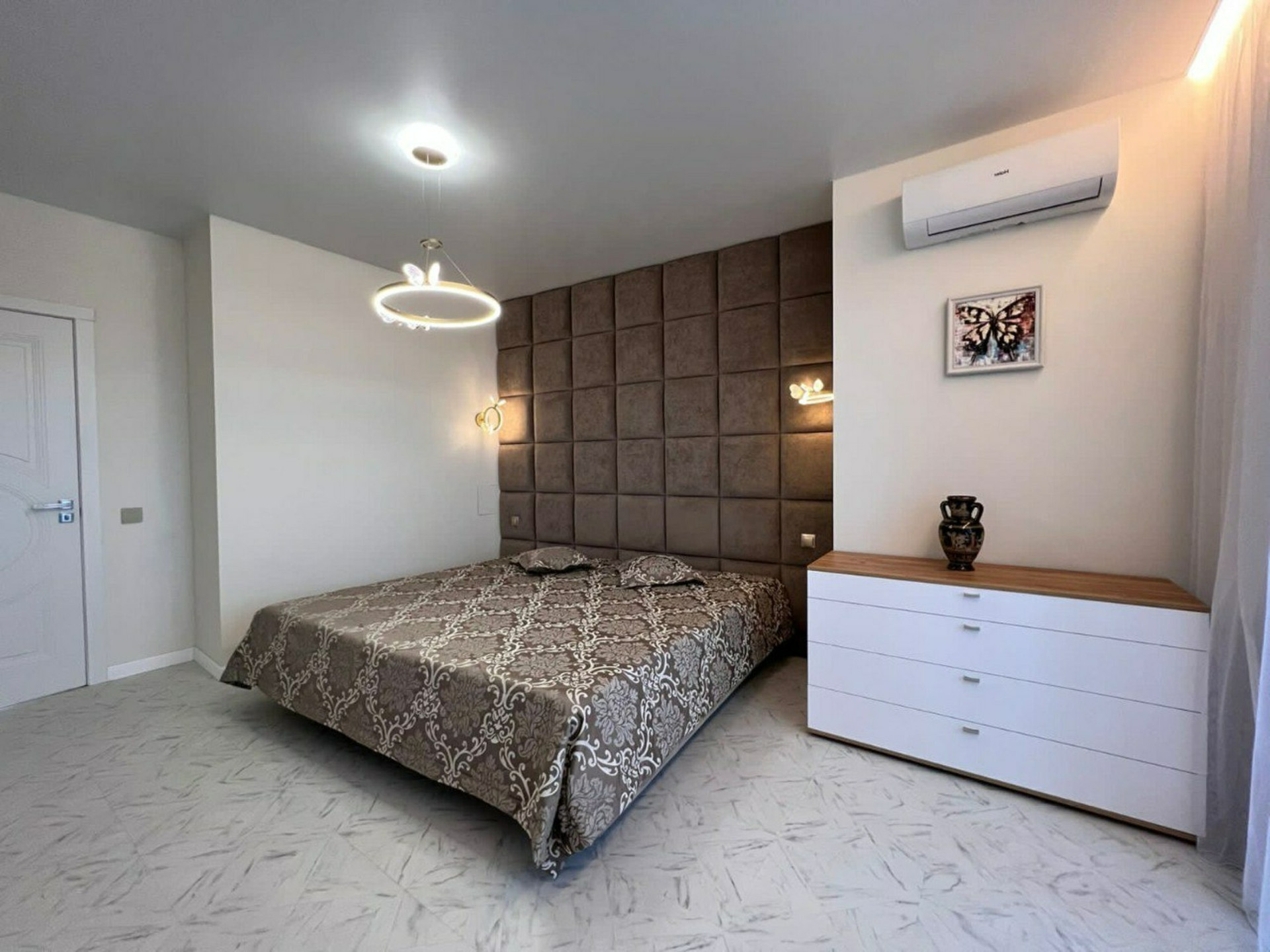 В квартире: кухня-гостиная, две спальни, гардеробная, совмещённый туалет с ванной.