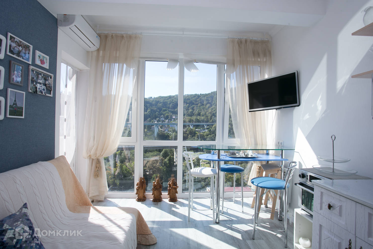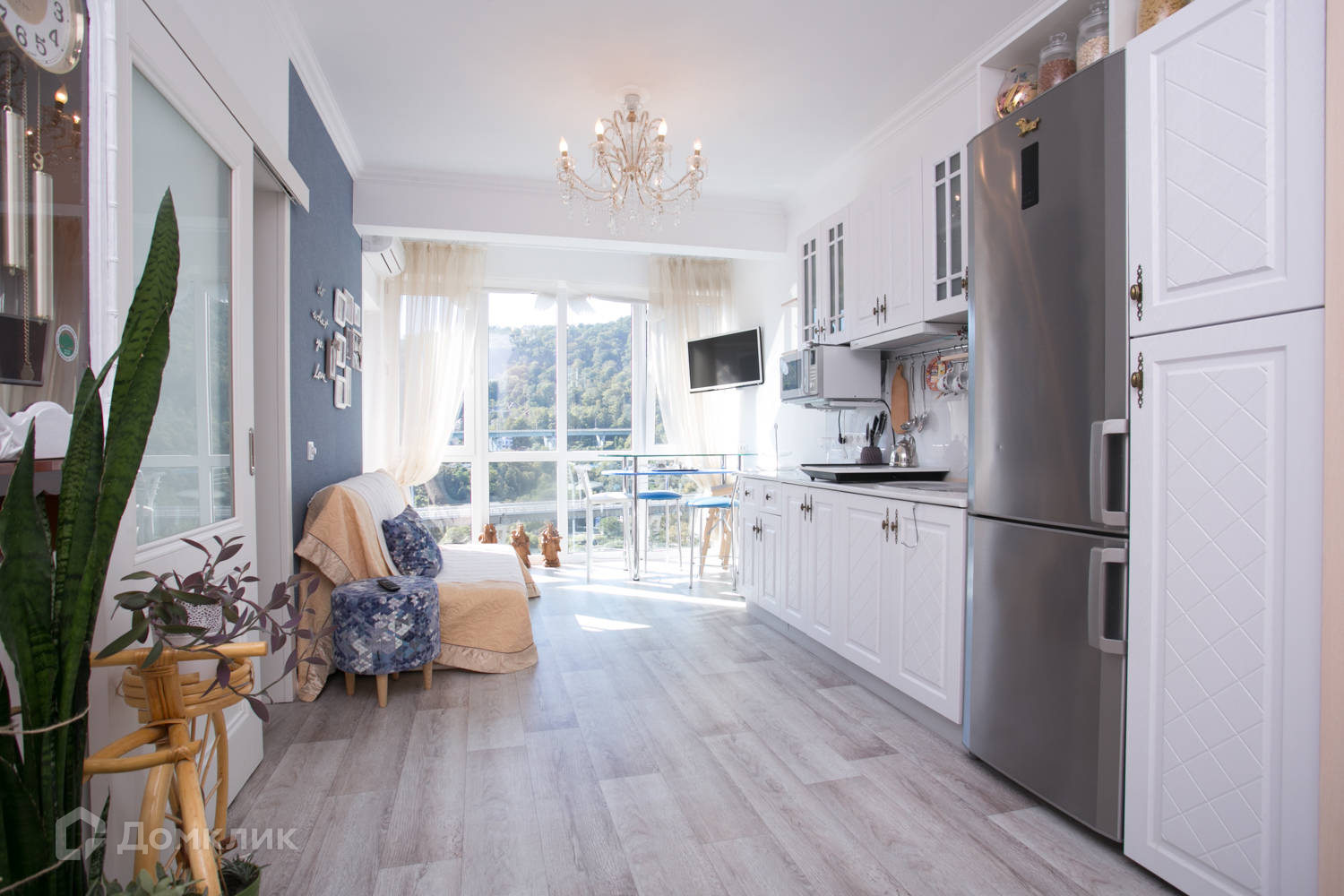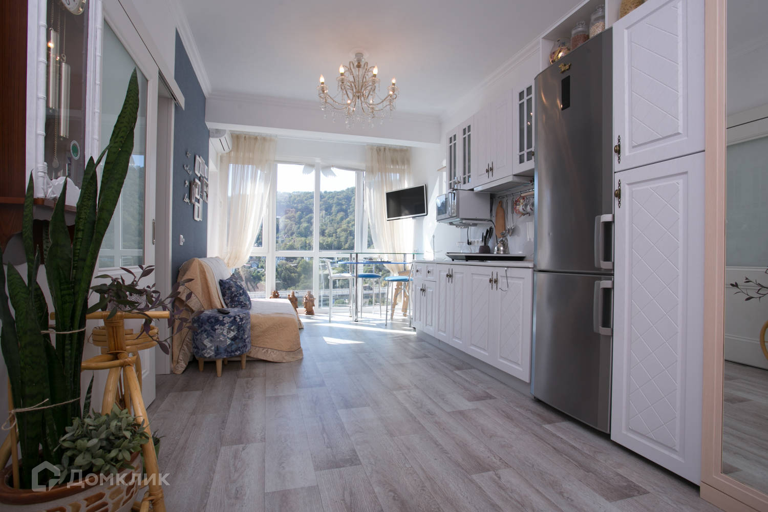 Квартира имеет очень комфортную планировку на 31,3 м2 площади расположены кухня-гостиная и закрытая спальня с окном, санузел совмещенный. Великолепный вид из панорамного окна на зелень Сочинского национального парка и горы, а также боковой вид на море с балкона.
