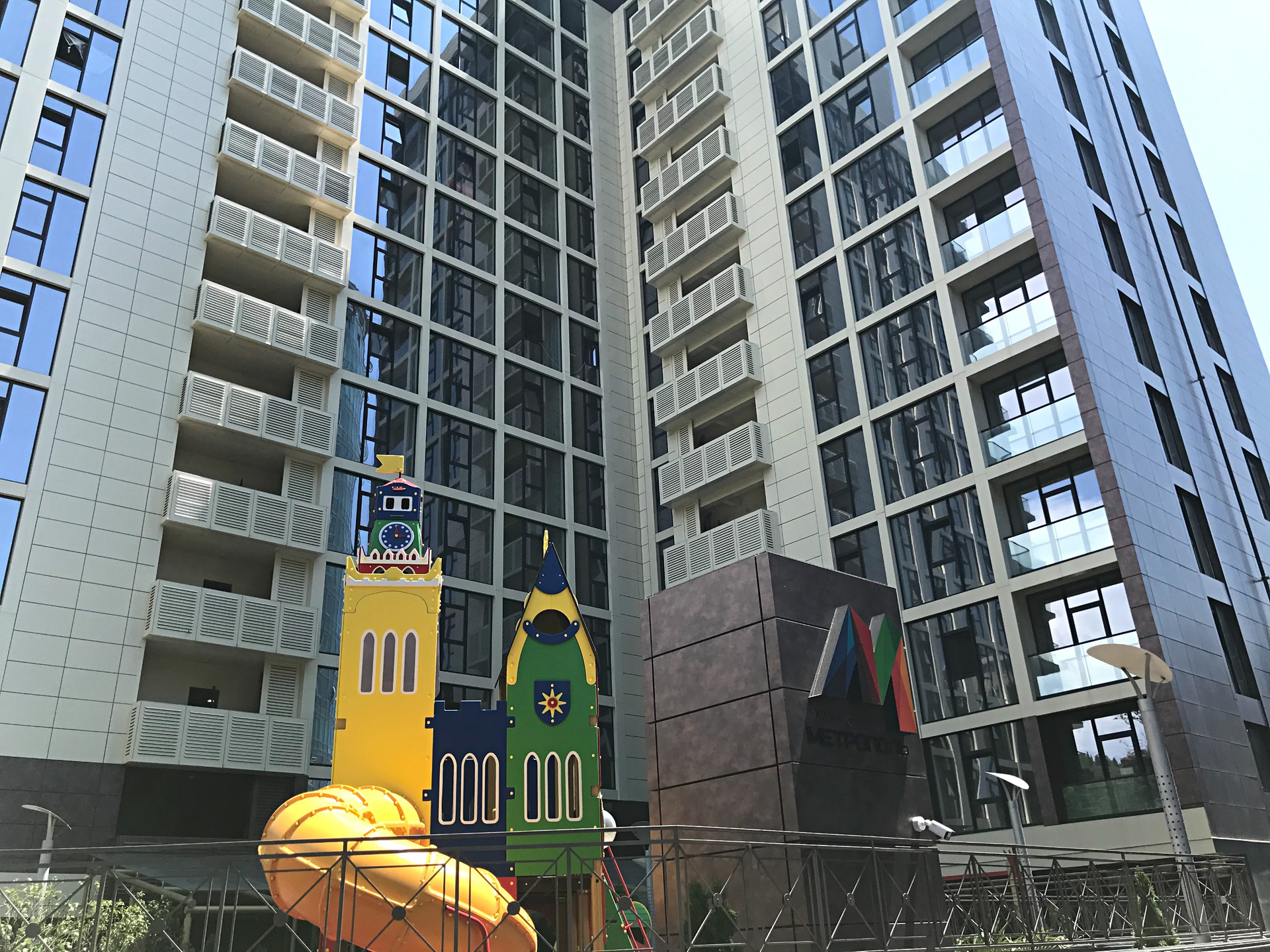Просторная и огороженная придомовая территория находится под постоянной профессиональной охраной. Во дворе расположены детская и спортивная площадки, зона отдыха, автомобильная стоянка, выполнено ландшафтное озеленение.