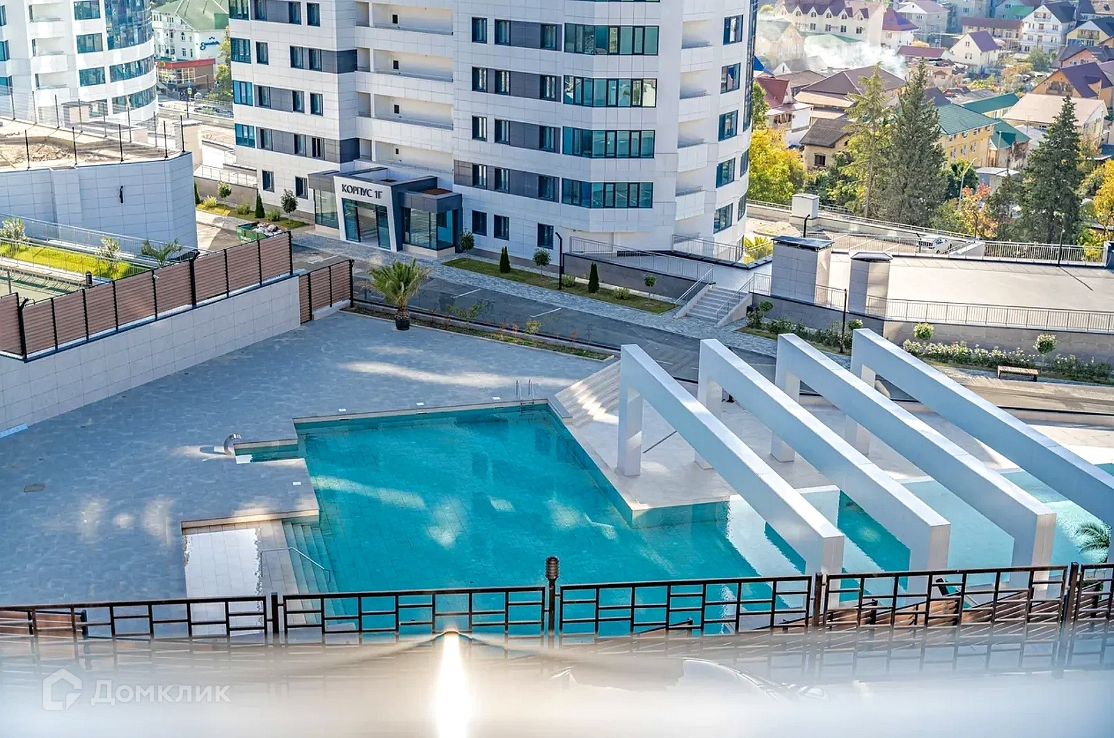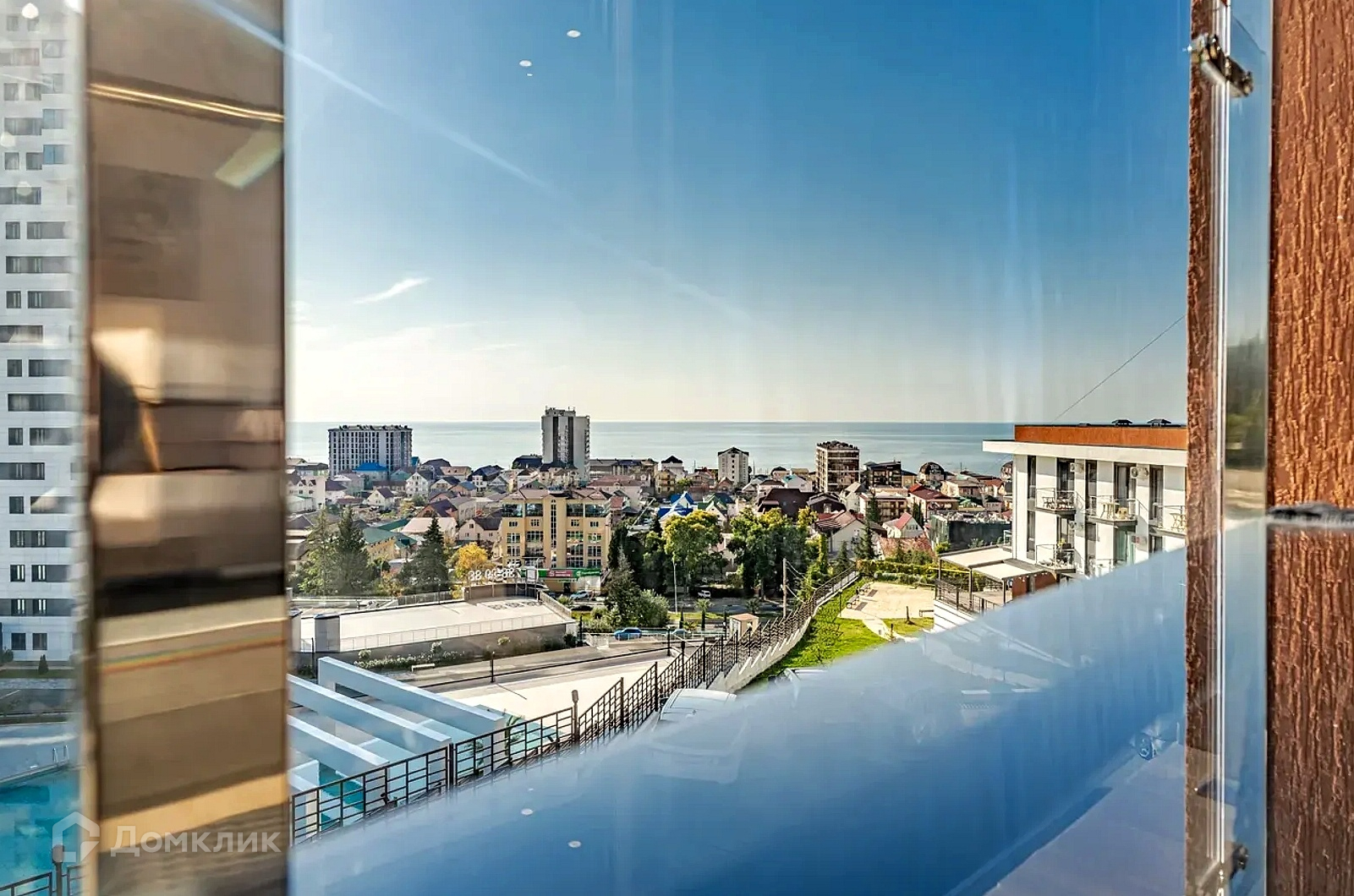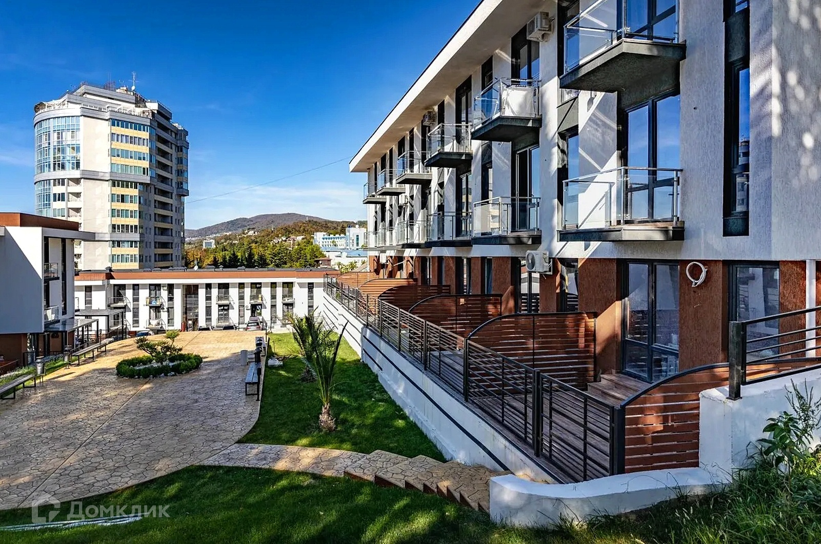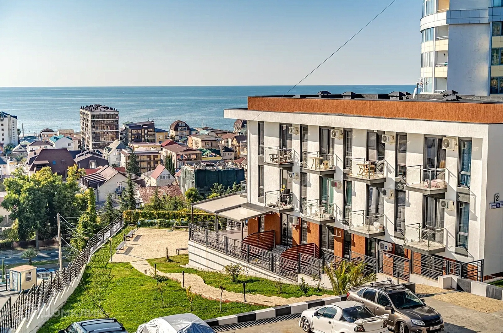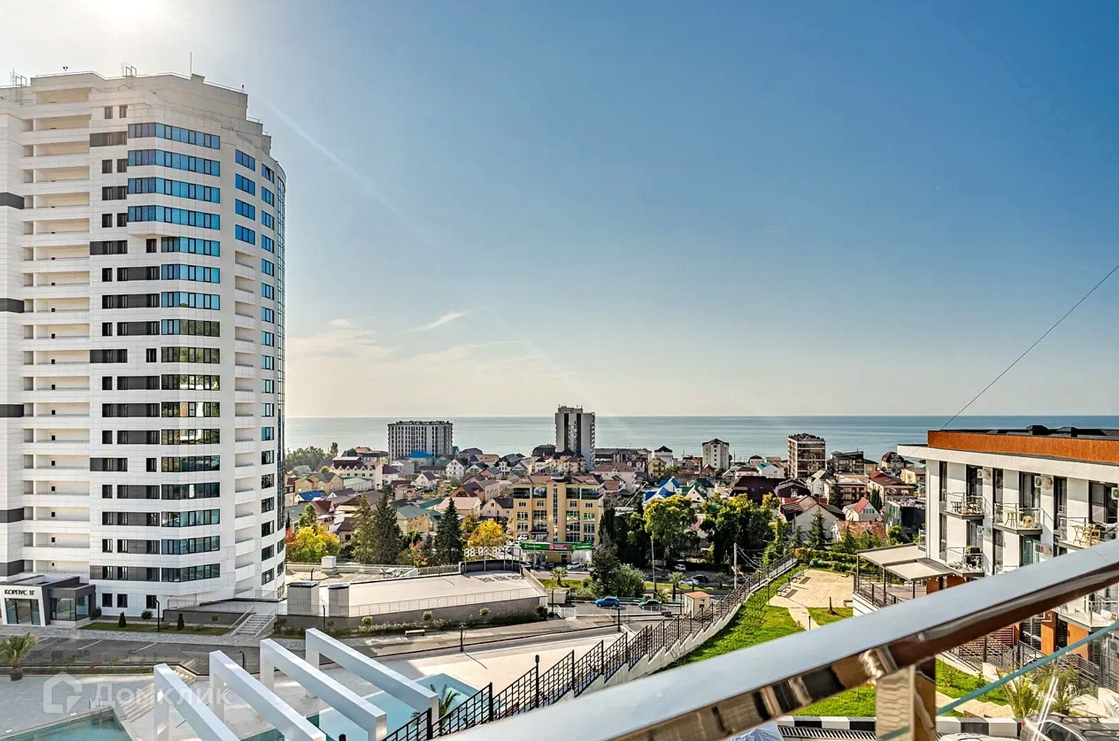 ЖК находится на возвышенности, благодаря чему на смотровой площадке открывается шикарный вид на море и горы.