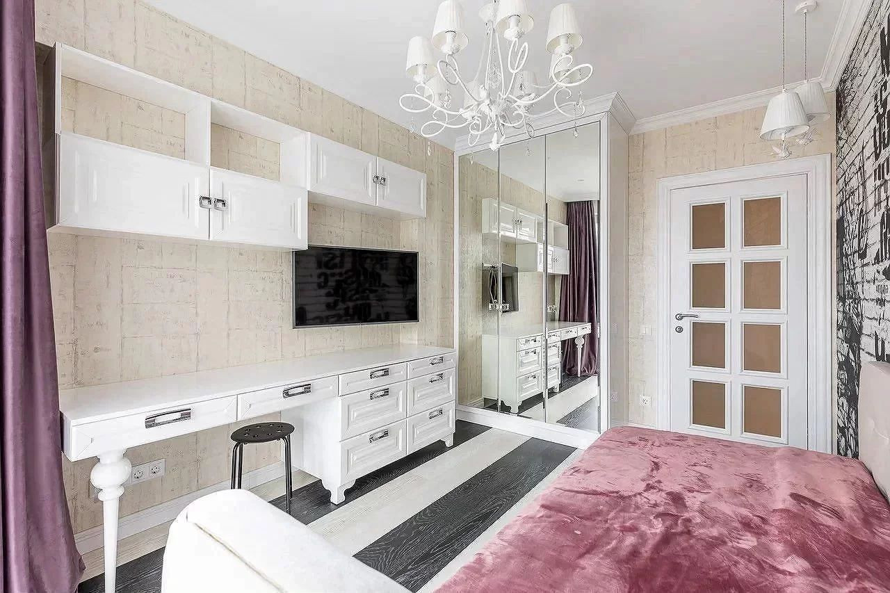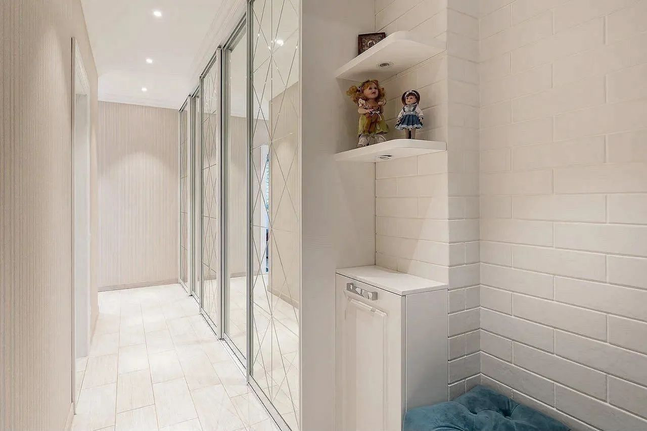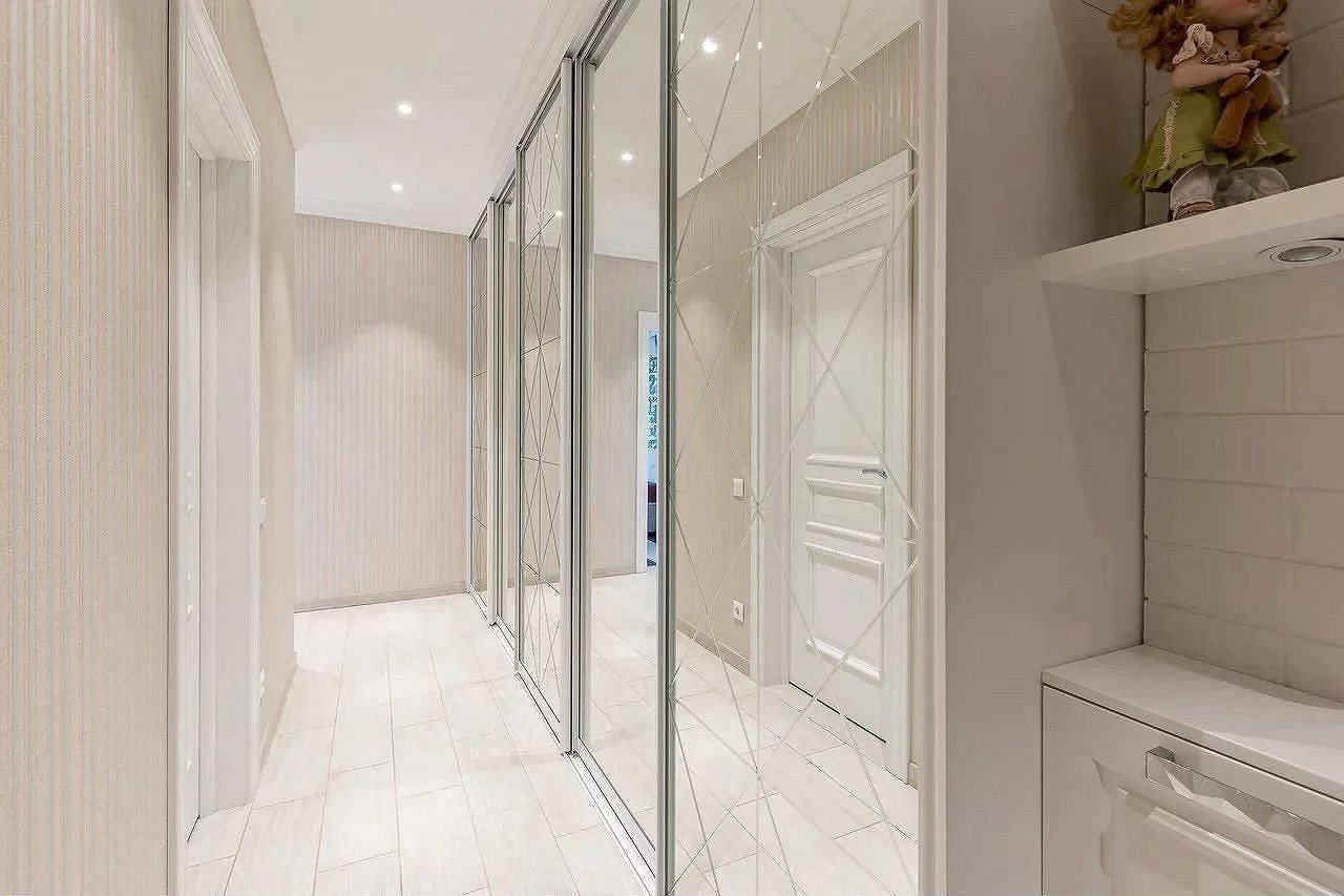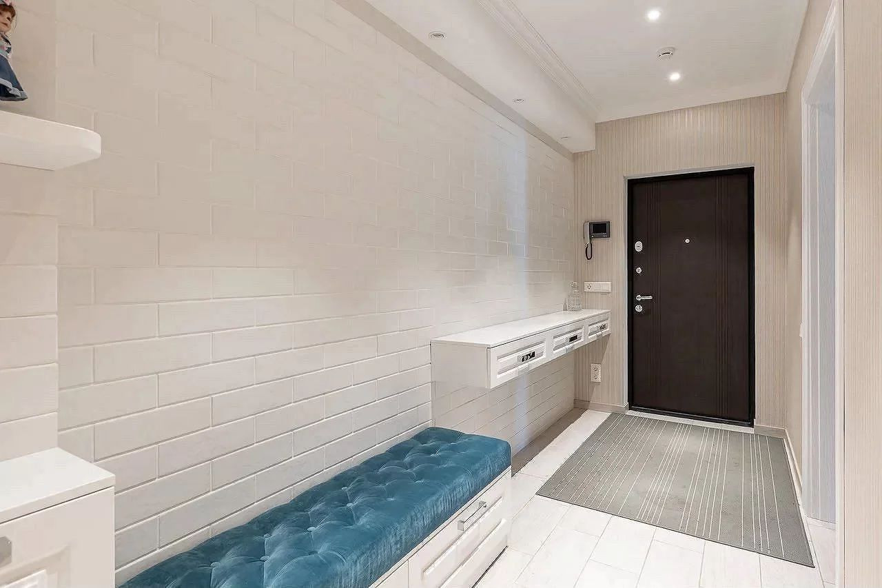 Квартира угловая, просторный коридор делит ее на три изолированные спальни, два санузла, гардеробную комнату и уютную кухню-гостиную.