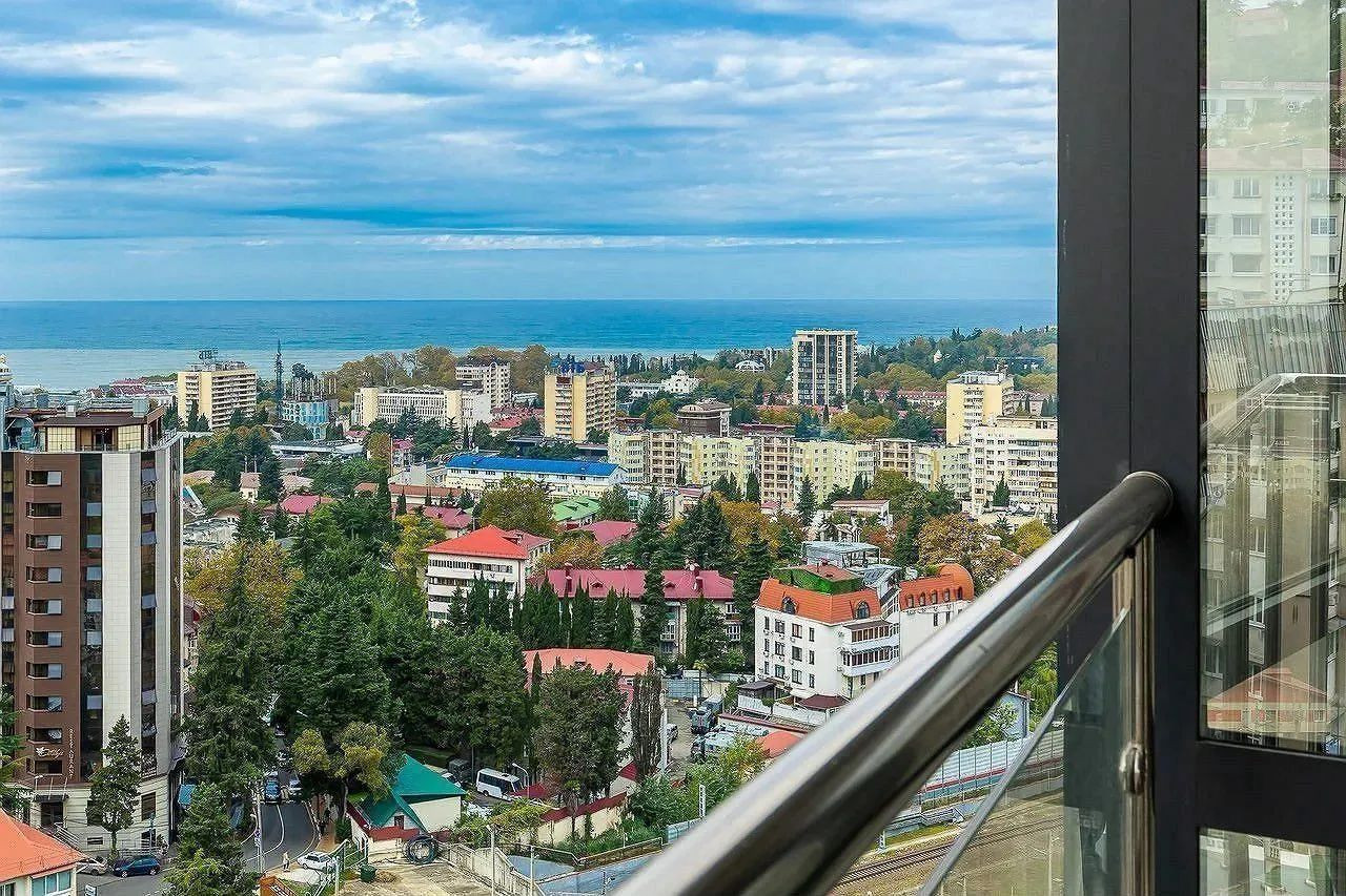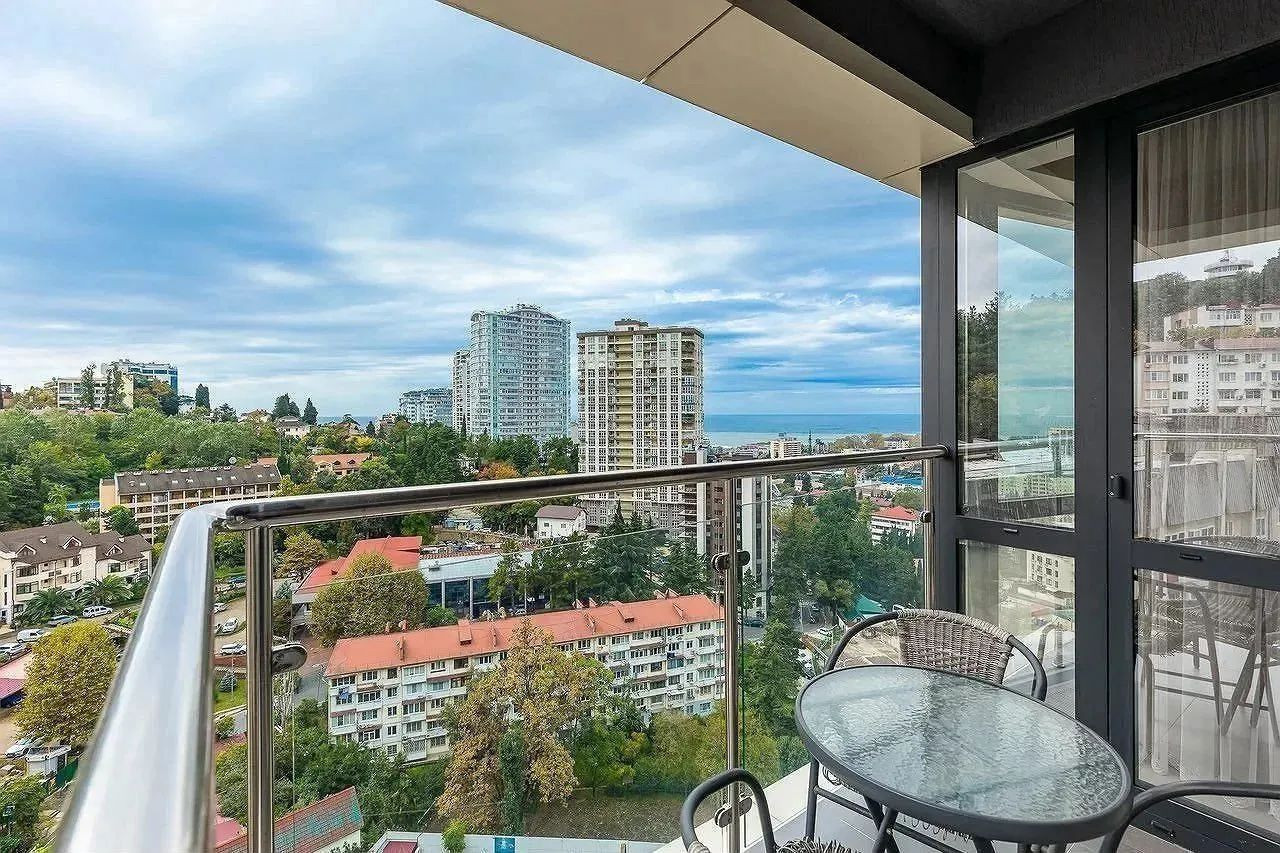 Окна панорамные, из которых открывается красивый вид на море, центр Сочи и двор жилого комплекса.