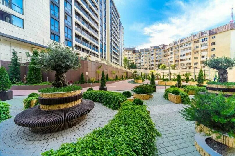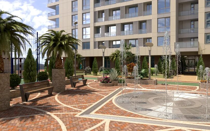 Как раз немного напишу про двор. Это закрытая территория, концепция «без машин», для автомобилей предусмотрен подземный паркинг. К пользованию жильцов: зона отдыха с фонтаном, детские и спортивные площадки, служба ресепшн, колясочная комната, велостоянка, круглосуточная охрана.
