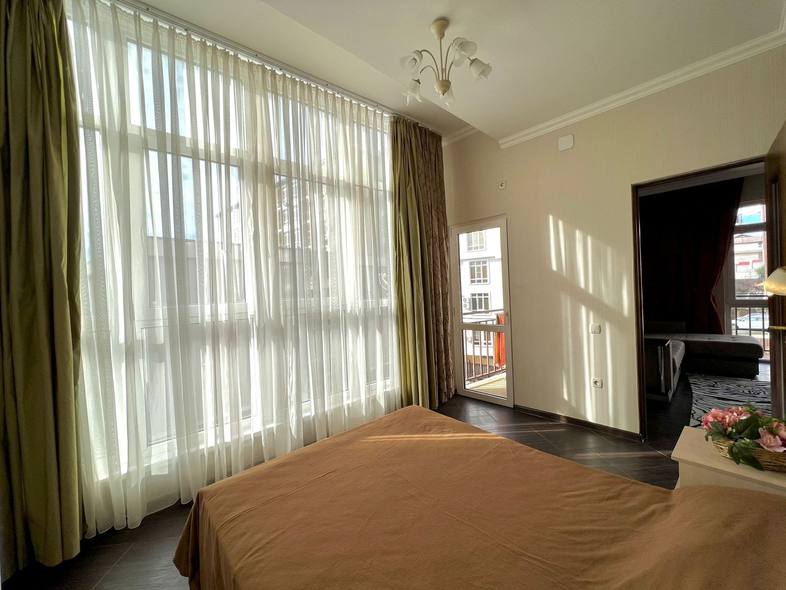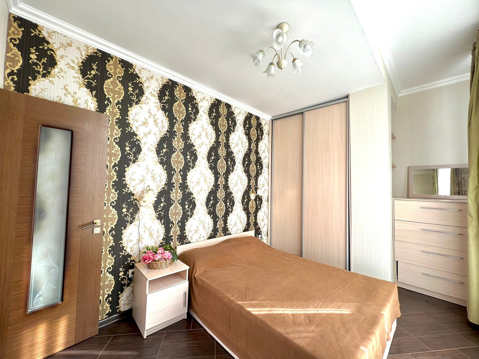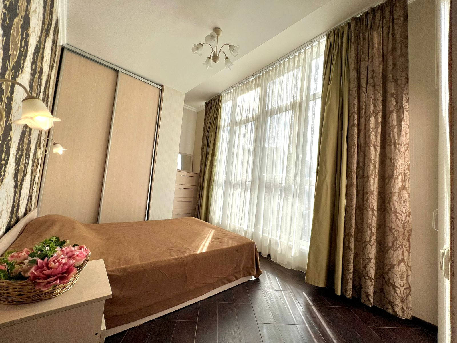 Комфортная вместительная спальная с шкафом-купе и комодом и выходом на второй балкон.