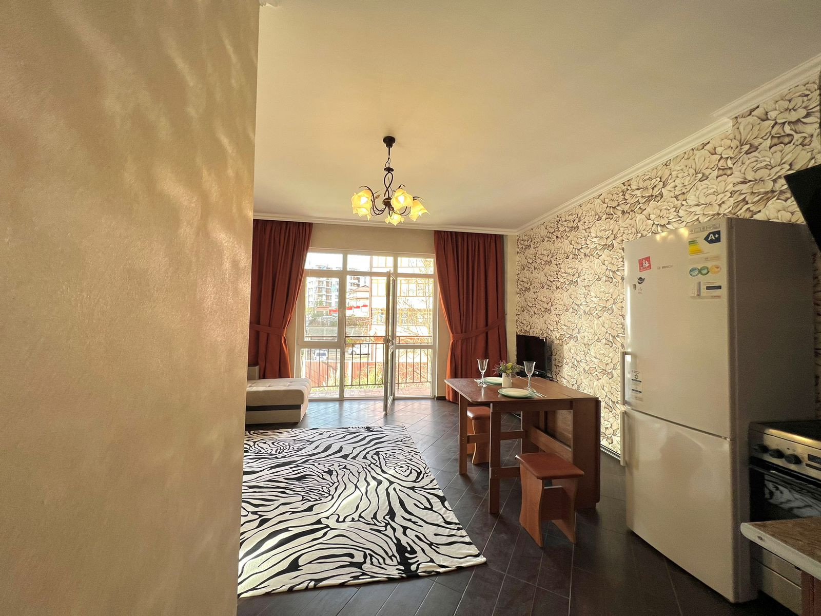 Большая кухня-гостиная с панорамным окном и выходом на балкон