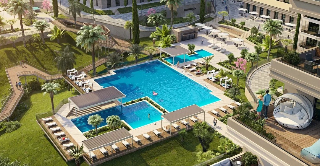 В комплексе: три бассейна, в том числе с морской водой, фитнес-центр, развлекательные, гастрономические и торговые площади, детские развивающие центры, конференц-залы.