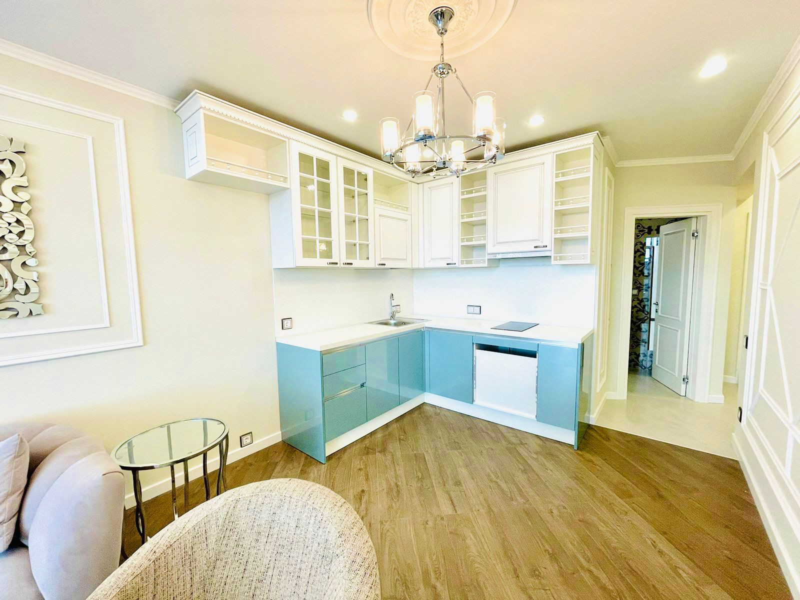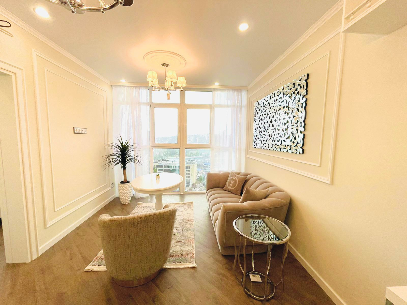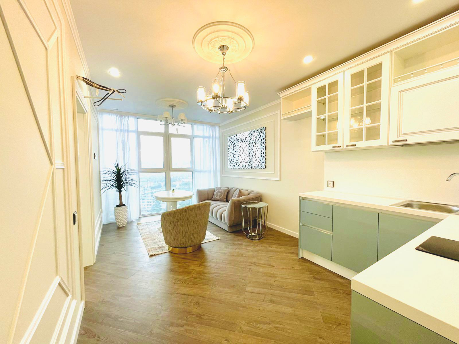 Вместительная кухня гостинная. Отдельная спальная комната. Вся квартира обставлена итальянской мебелью. Дизайнерский ремонт. Витражное остекление. Вид на море.