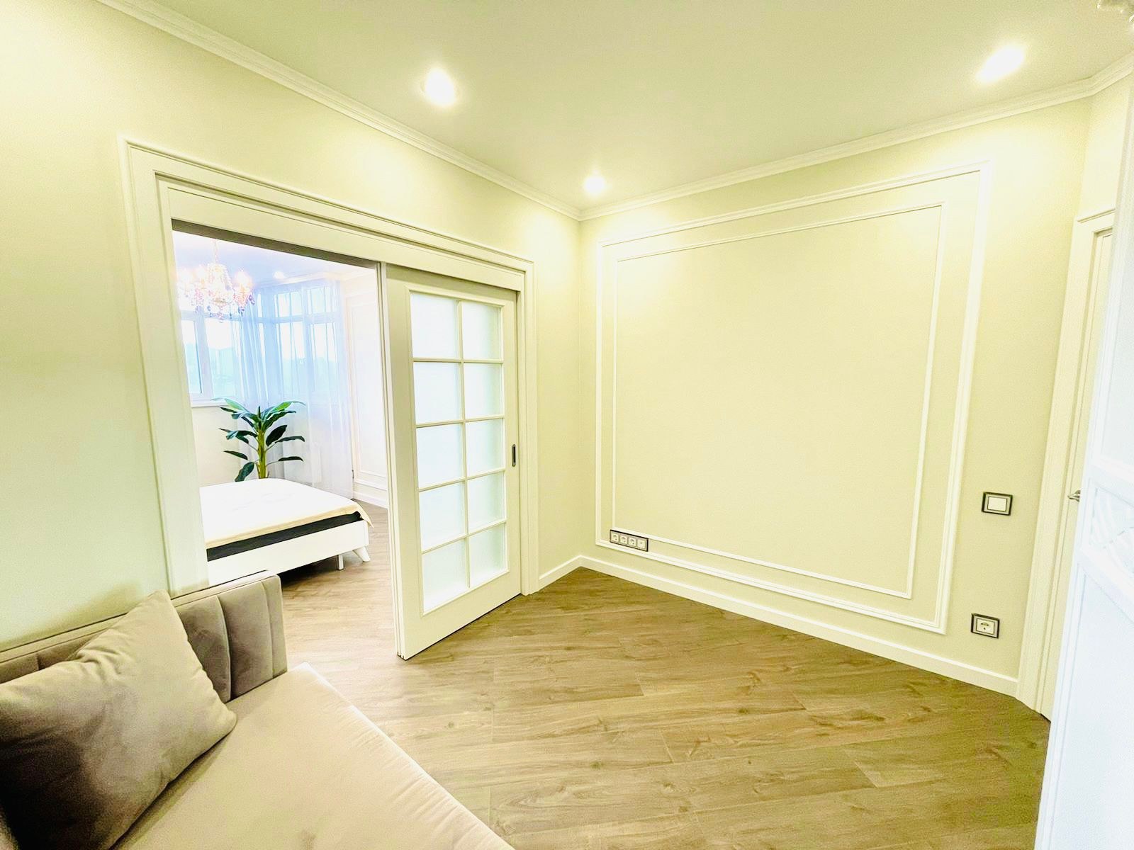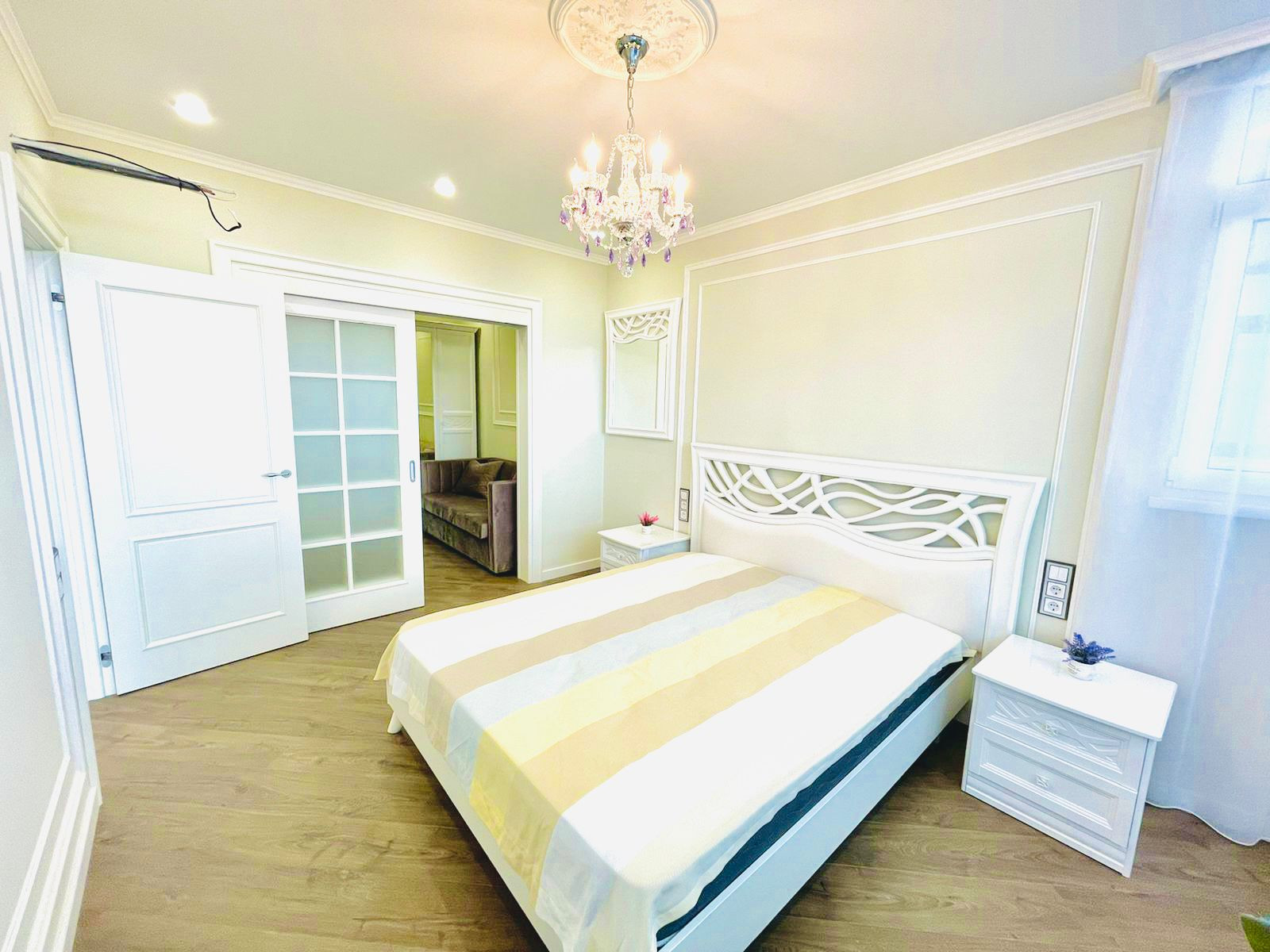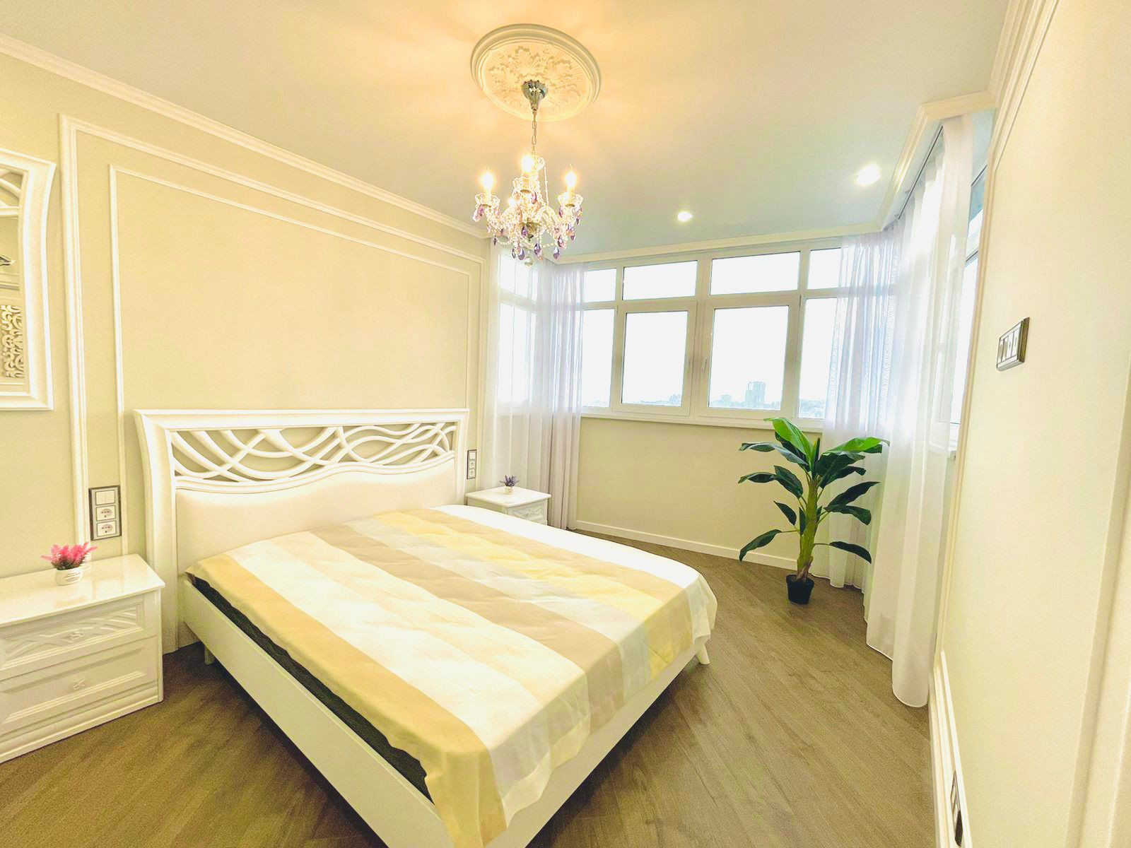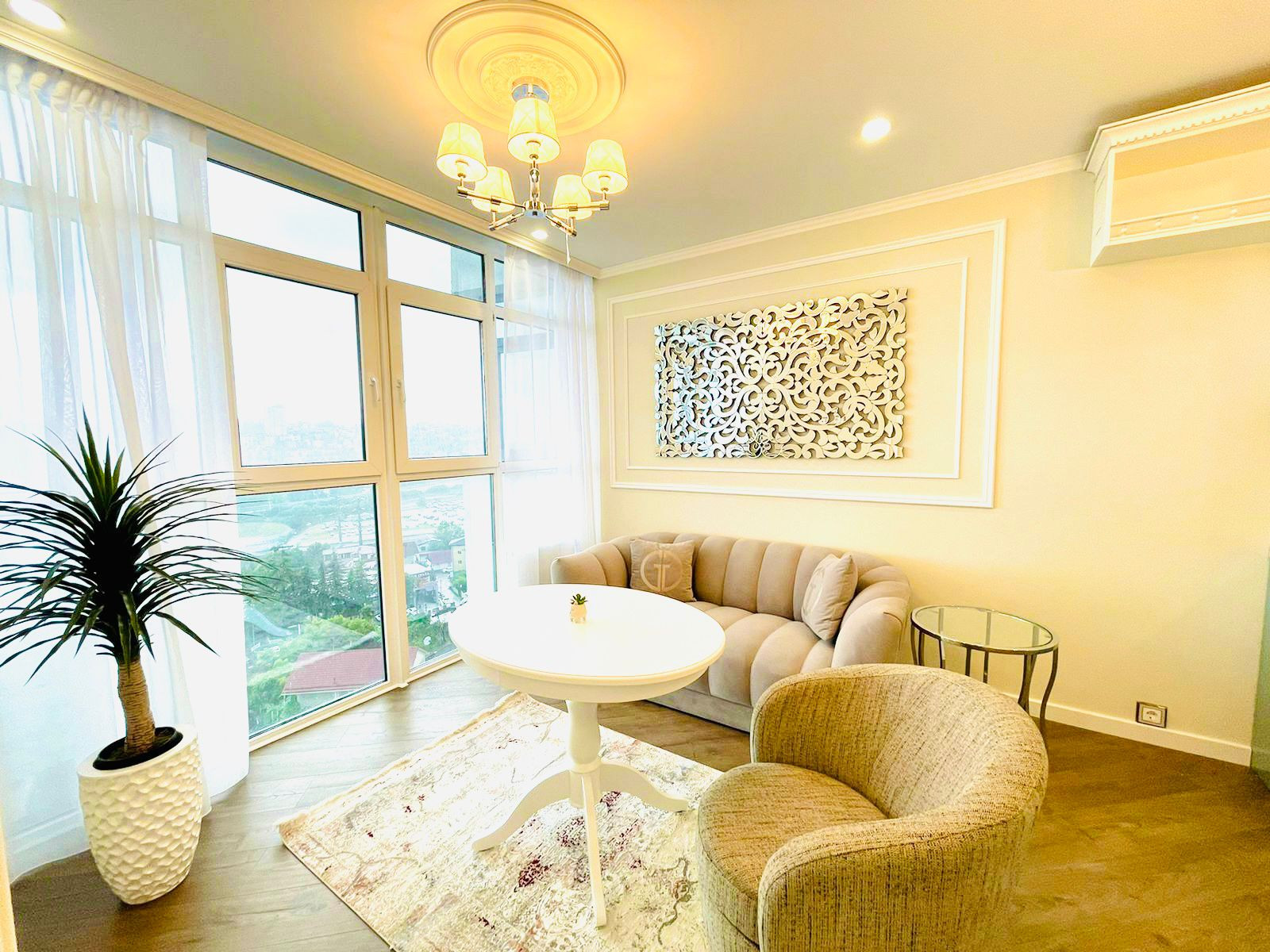 Вместительная кухня гостинная. Отдельная спальная комната. Вся квартира обставлена итальянской мебелью. Дизайнерский ремонт. Витражное остекление. Вид на море.