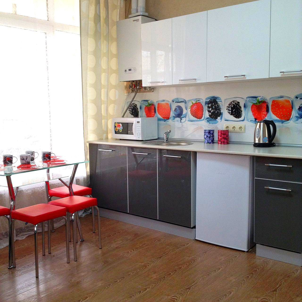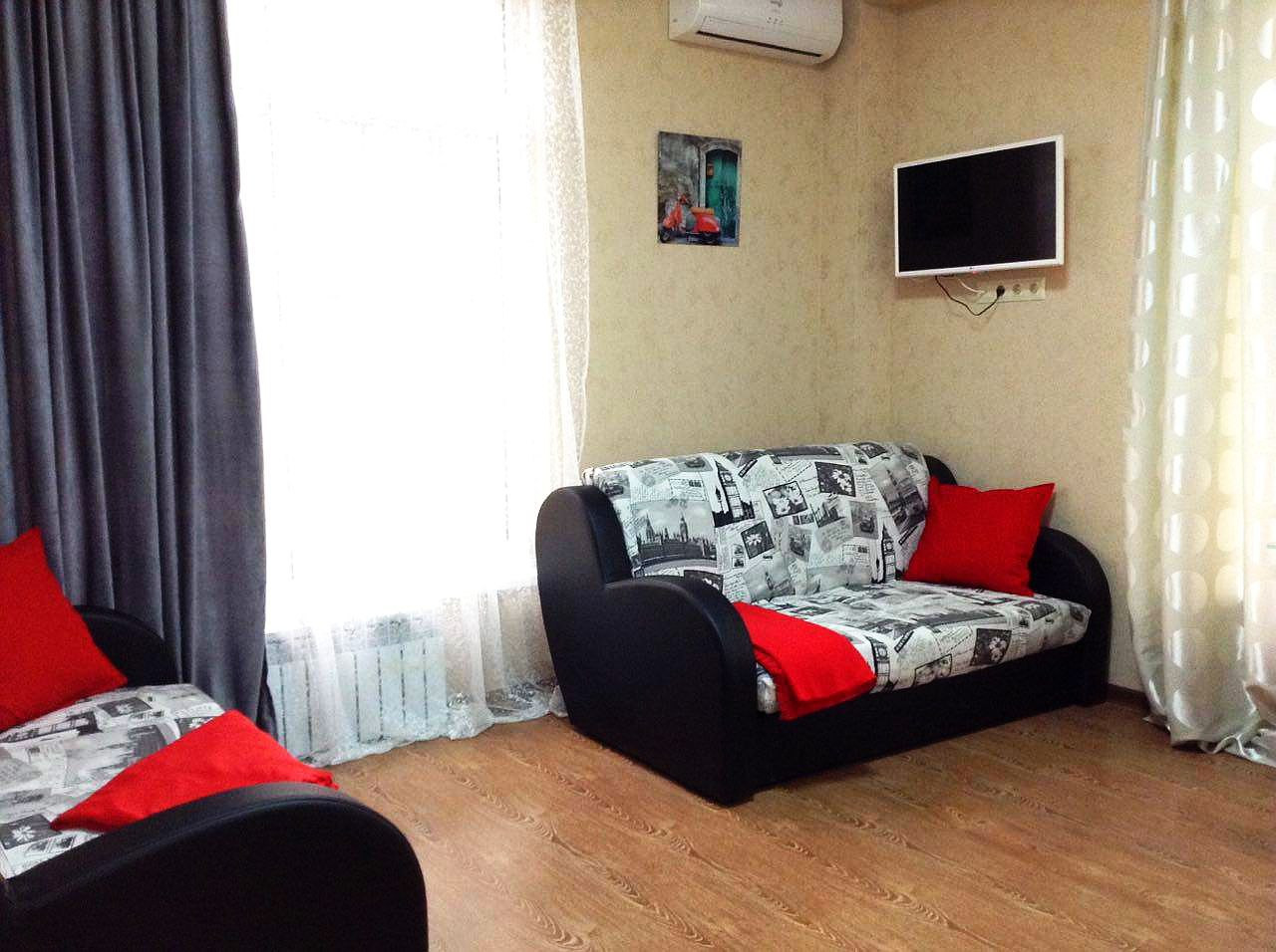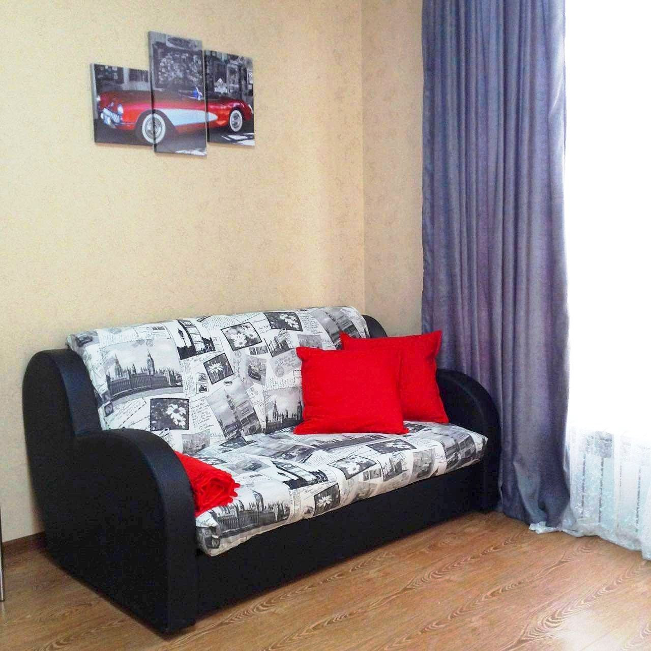 В квартире есть два 2-х спальных удобных дивана. Также квартира оборудована современной бытовой техникой: телевизор с плоским экраном и кабельными каналами, Wi-Fi, микроволновая печь, холодильник, стиральная машина.