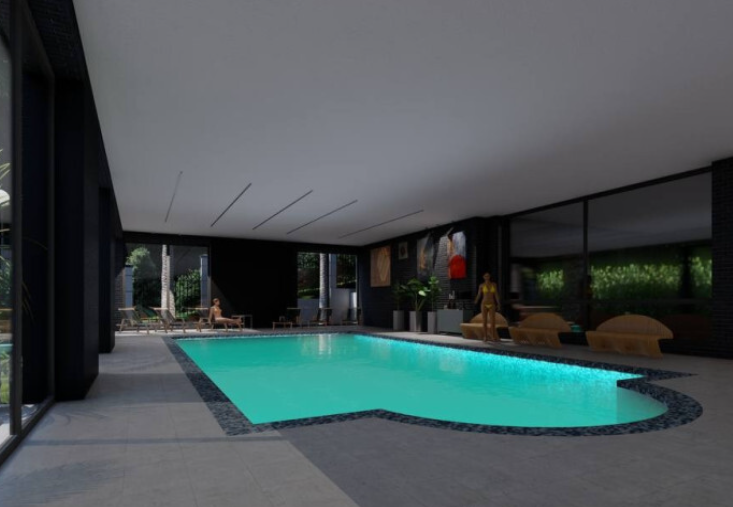 На территории комплекса расположены бассейн, спортзал, спа.