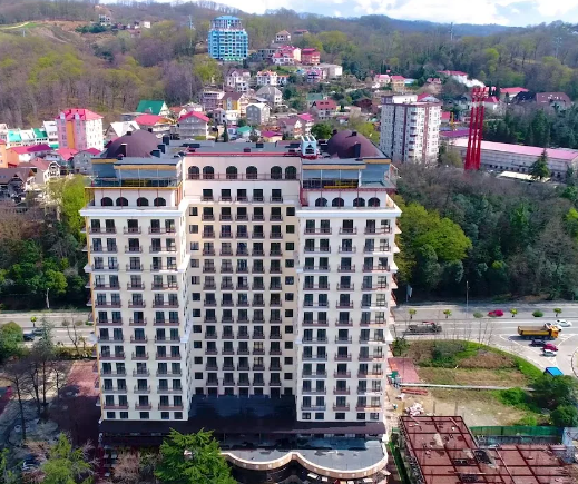 Комплекс находится в Адлерском районе, в Курортном городке. Ровное место, от дома до пляжа 300 метров по прогулочным дорожкам через парк с богатой субтропической флорой под высокими тенистыми деревьями.
