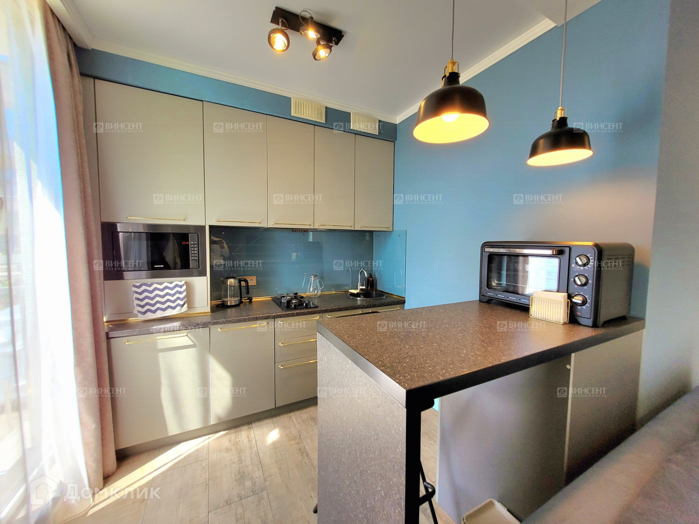 Кухня с барной стойкой, оборудована встраиваемой техникой : духовка, плита, посудомойка, микроволновка.