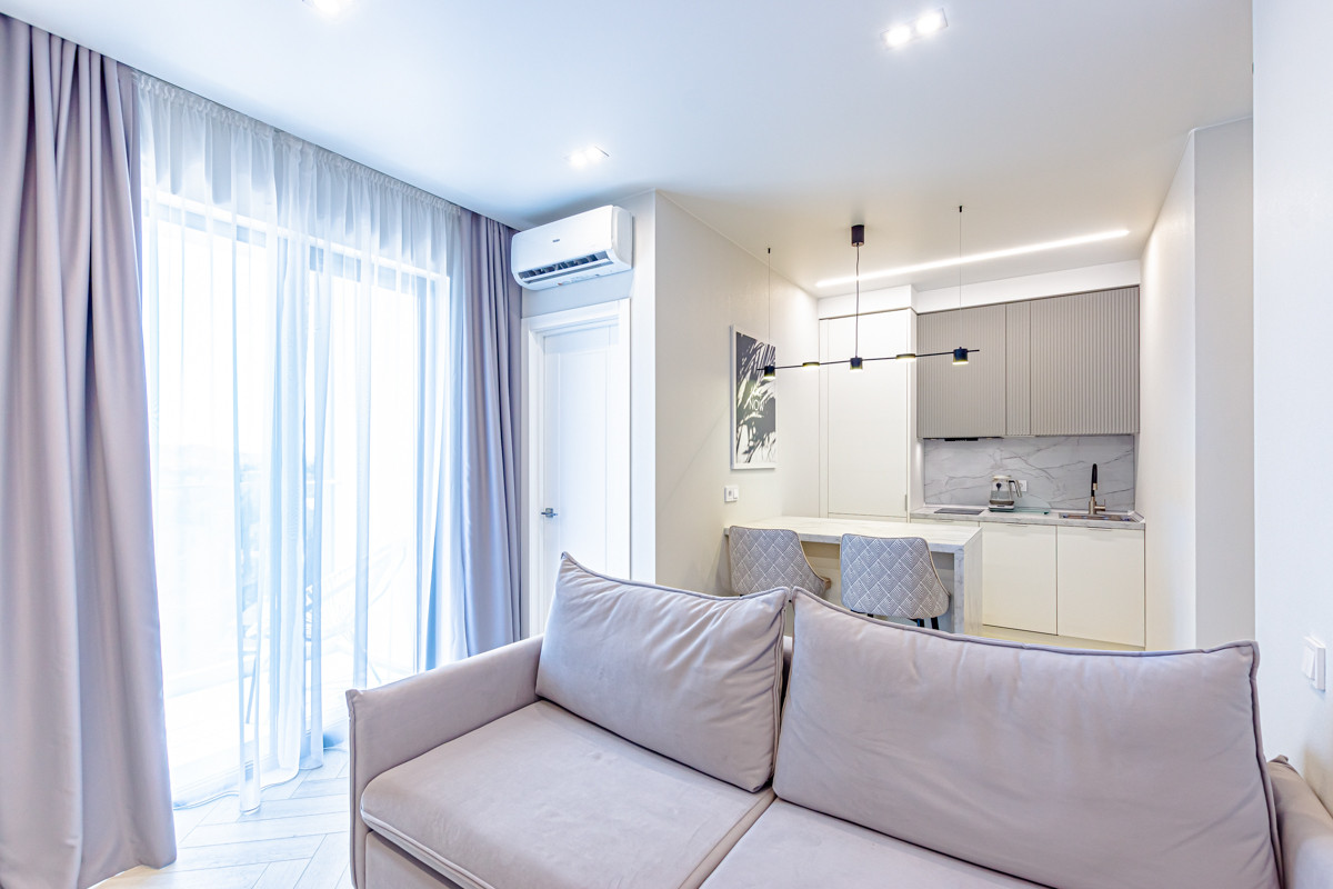 Планировка: спальня, кухня-гостиная, совмещенный с/у, гардеробная, открытый балкон с видом на море.
