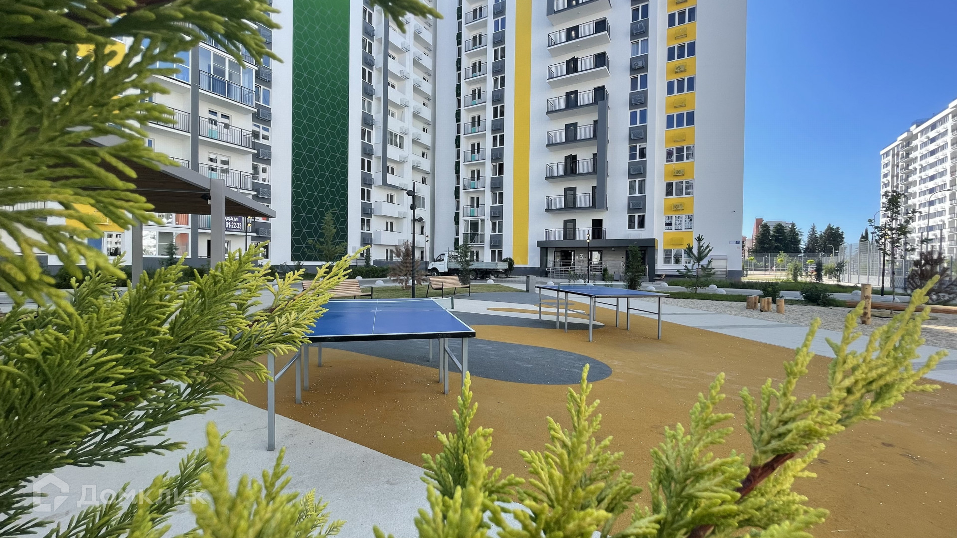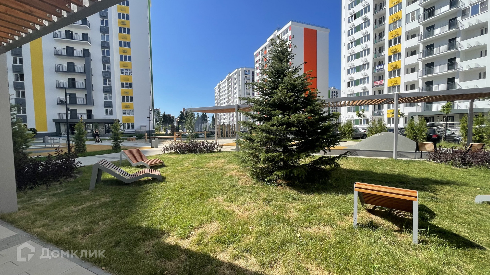Во дворе комплекса: озеленение, детские площадки, 1196 машино-мест для парковки, комьюнити-сад, места для отдыха под навесом.