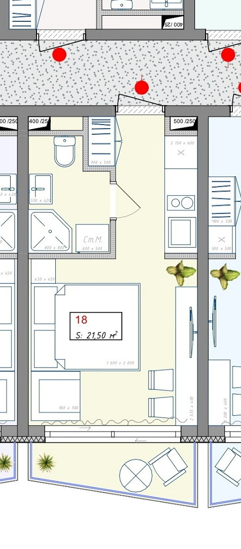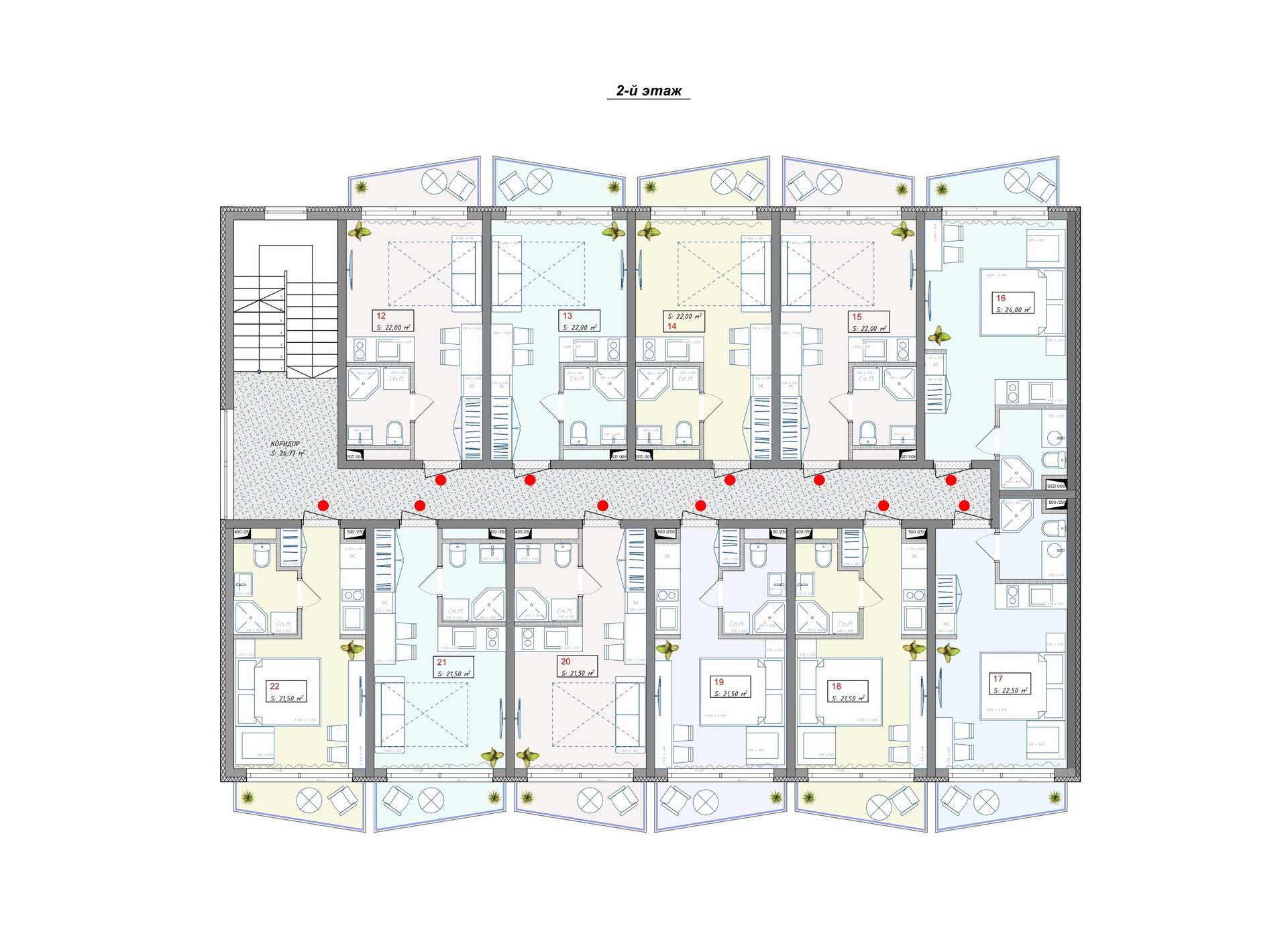 - Площади от 21,5 до 27,5 м2.