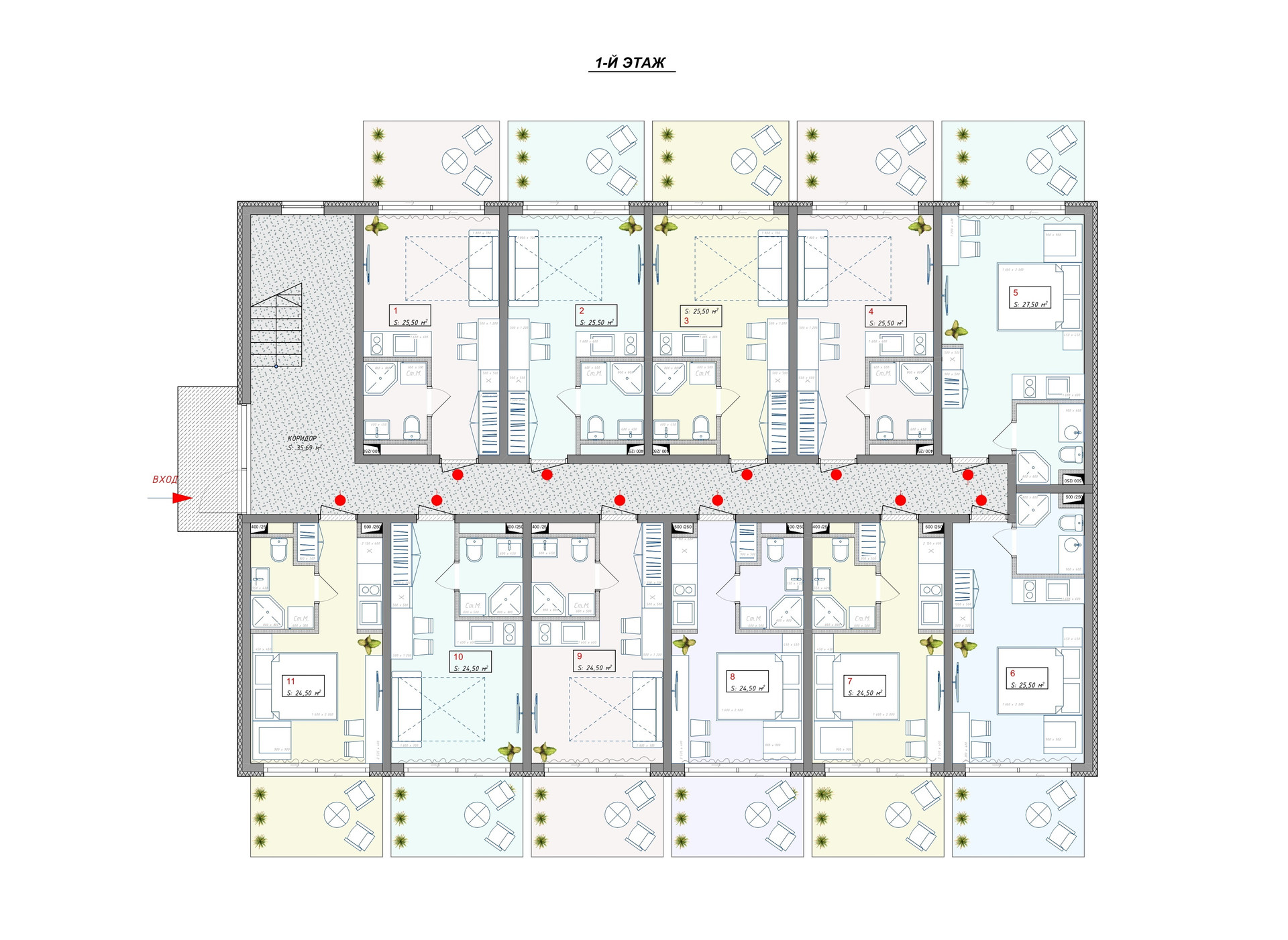 - Первый этаж, все апартаменты со своим личным двориком-террасой.