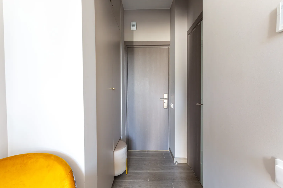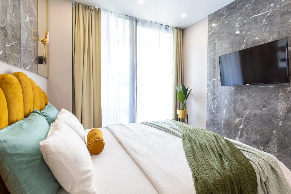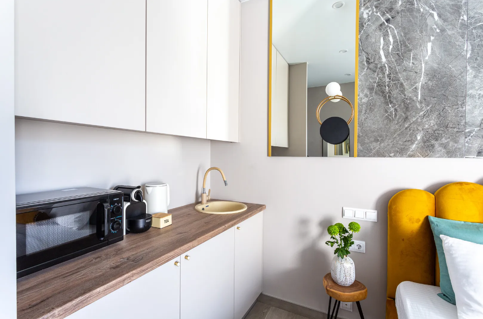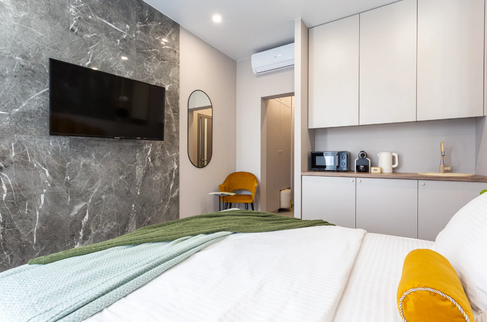 Красивая студия в апарт-комплексе оборудована двуспальной кроватью, кухонной зоной со всем необходимым для комфортного пребывания и санузлом с душевой кабиной.