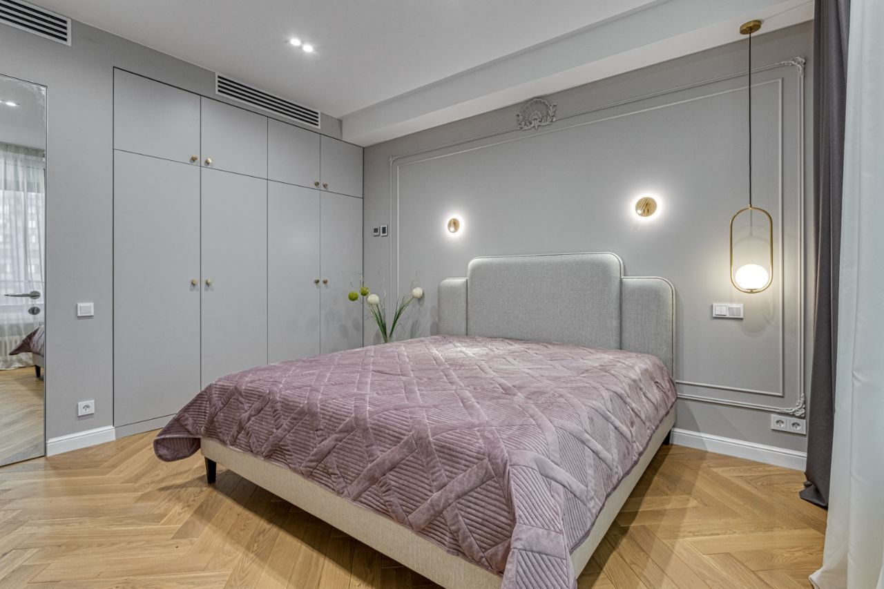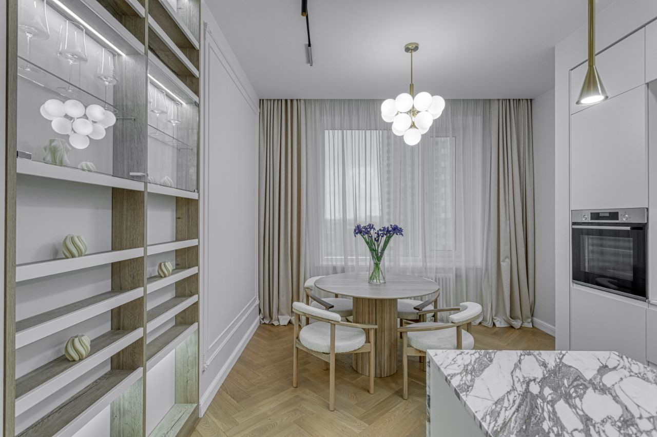 При входе в квартиру сразу же возникает ощущение уюта и гармонии. Все помещения выполнены в сдержанной цветовой гамме, где преобладают нейтральные тона, такие как бежевый, серый и кремовый. Это создает идеальное основание для эксклюзивной мебели и аксессуаров, которые придают интерьеру изысканность и стиль.