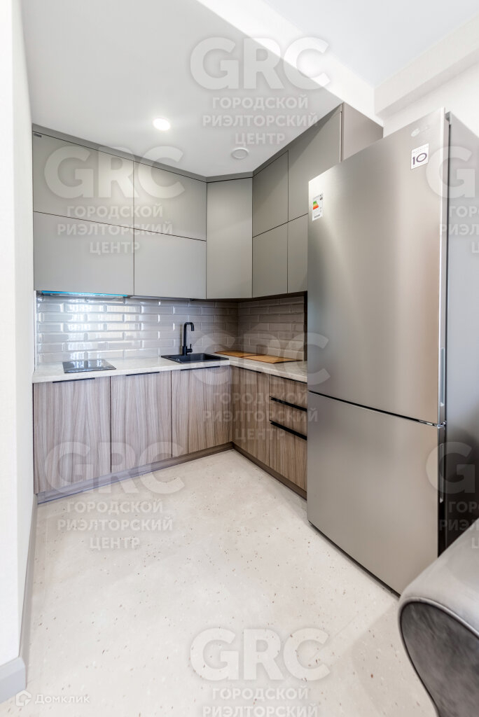 Установлен кухонный гарнитур со встроенной техникой.