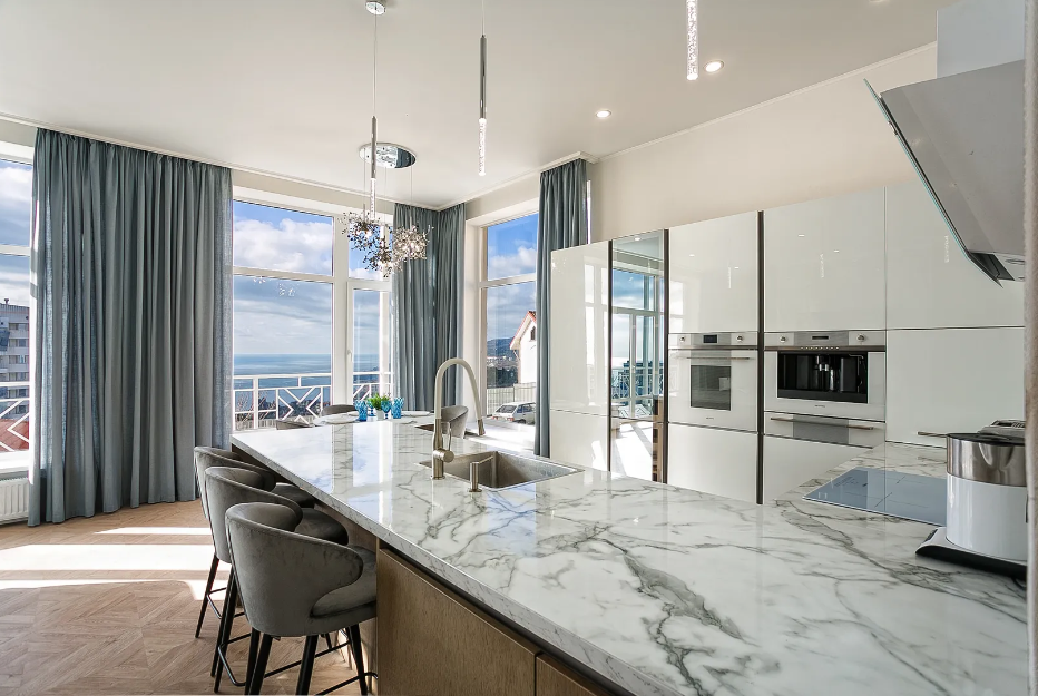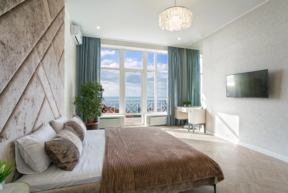 Очень светлая, четыре панорамных окна с балконами. Везде теплый пол.