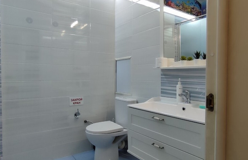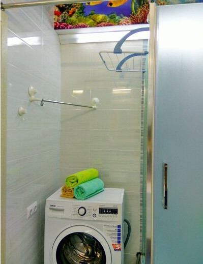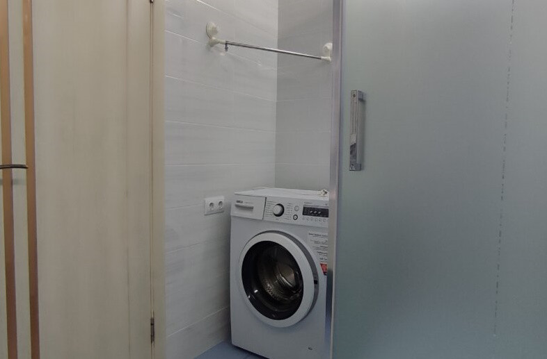 Ванная комната выполнена в современном стиле, с использованием качественных материалов и оборудования. Здесь вы найдете все необходимое для вашего комфорта, включая душевую кабину, умывальник, туалет и стиральную машину.