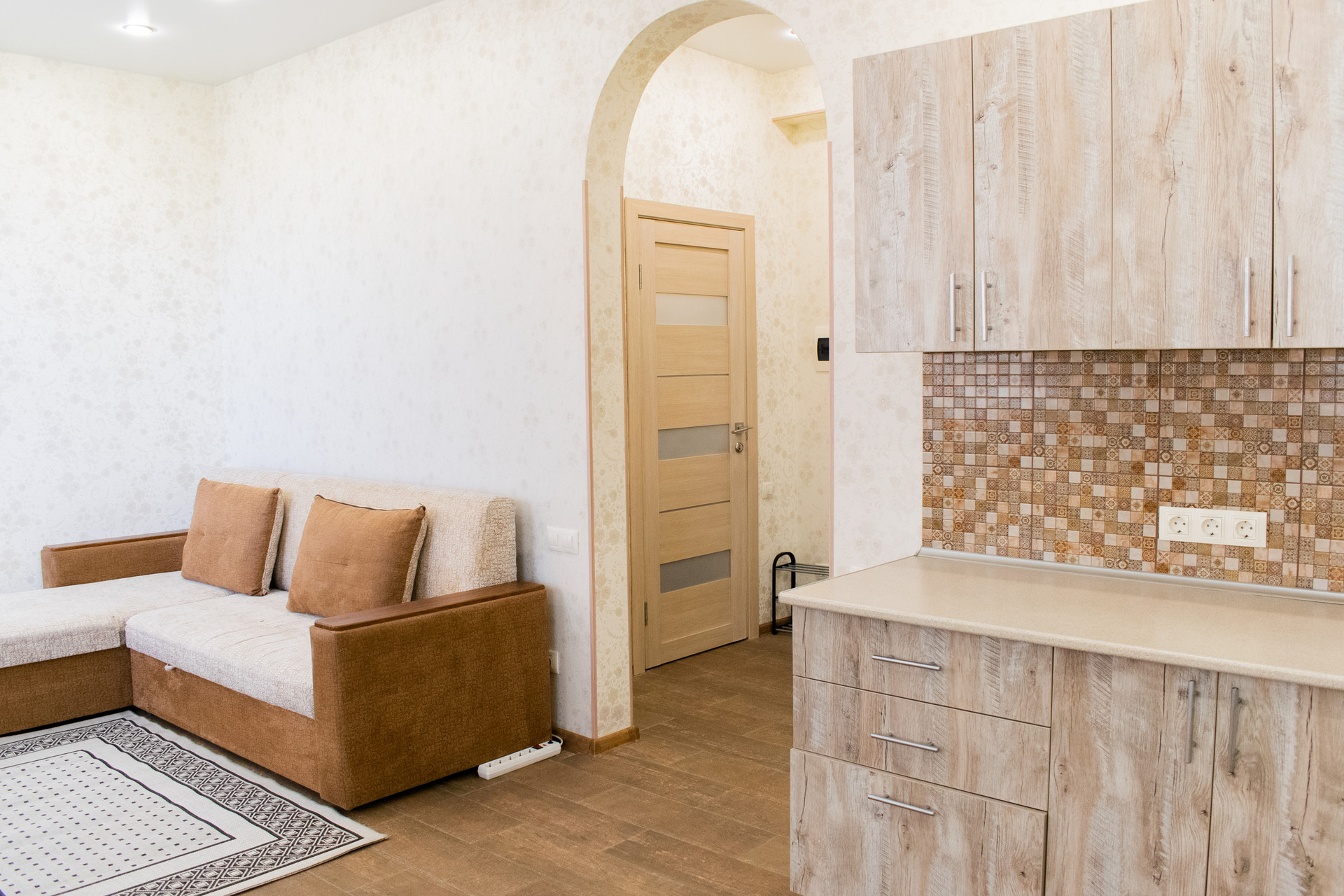 Квартира светлая и просторная. Можно разделить студию перегородкой для деления квартирного пространства на несколько комнат.