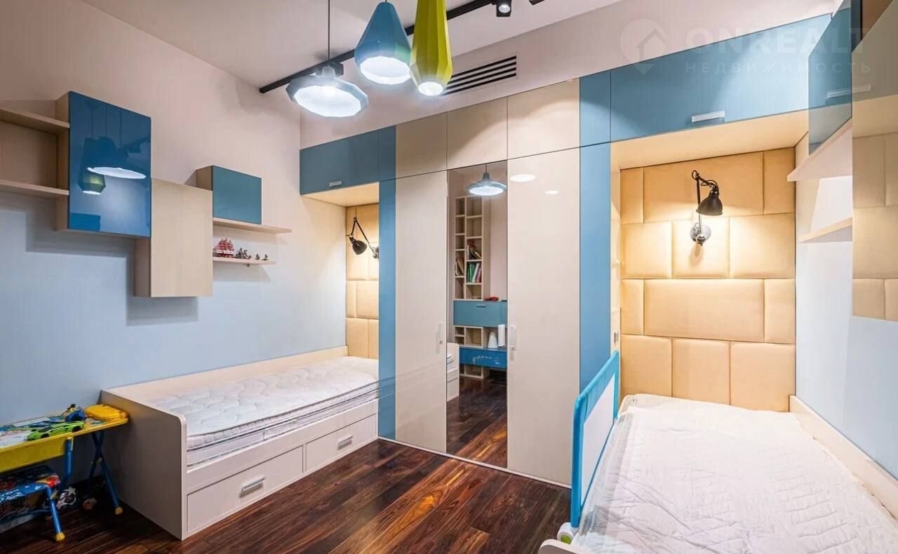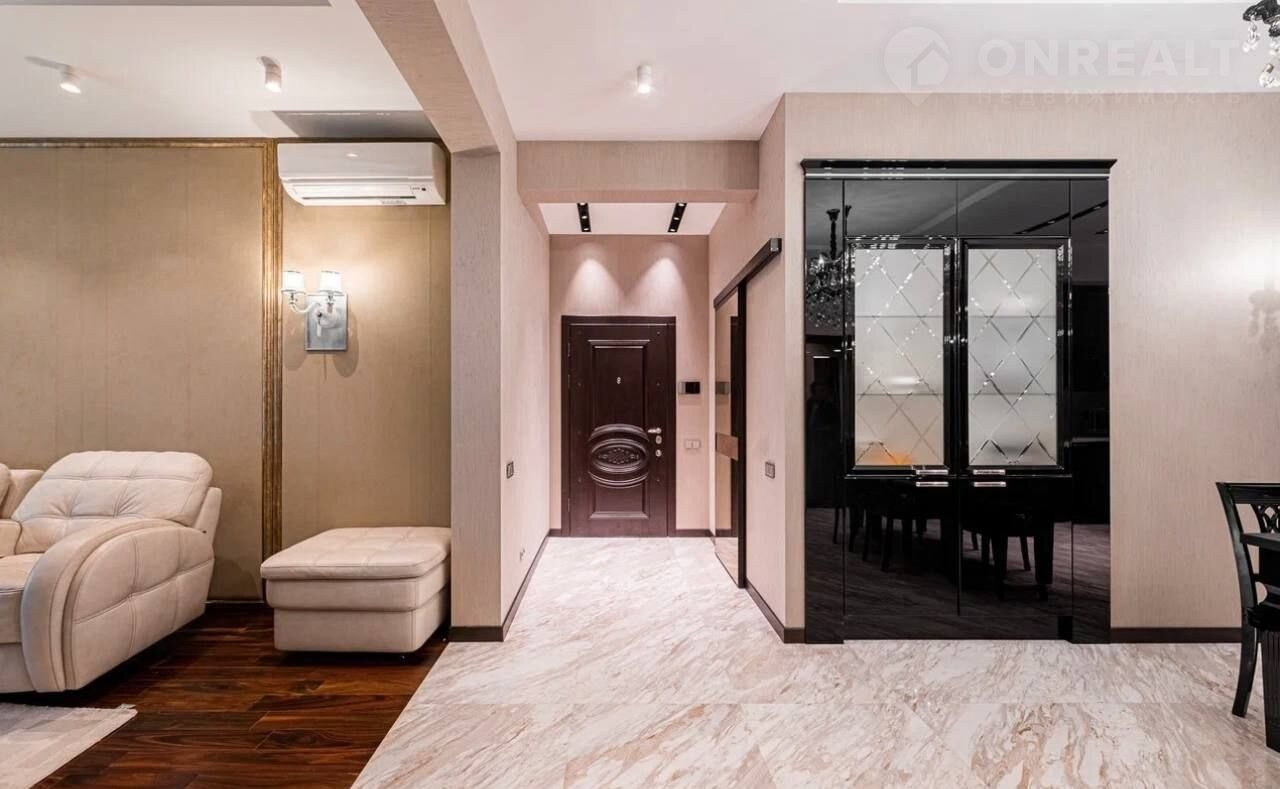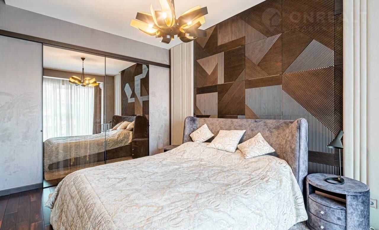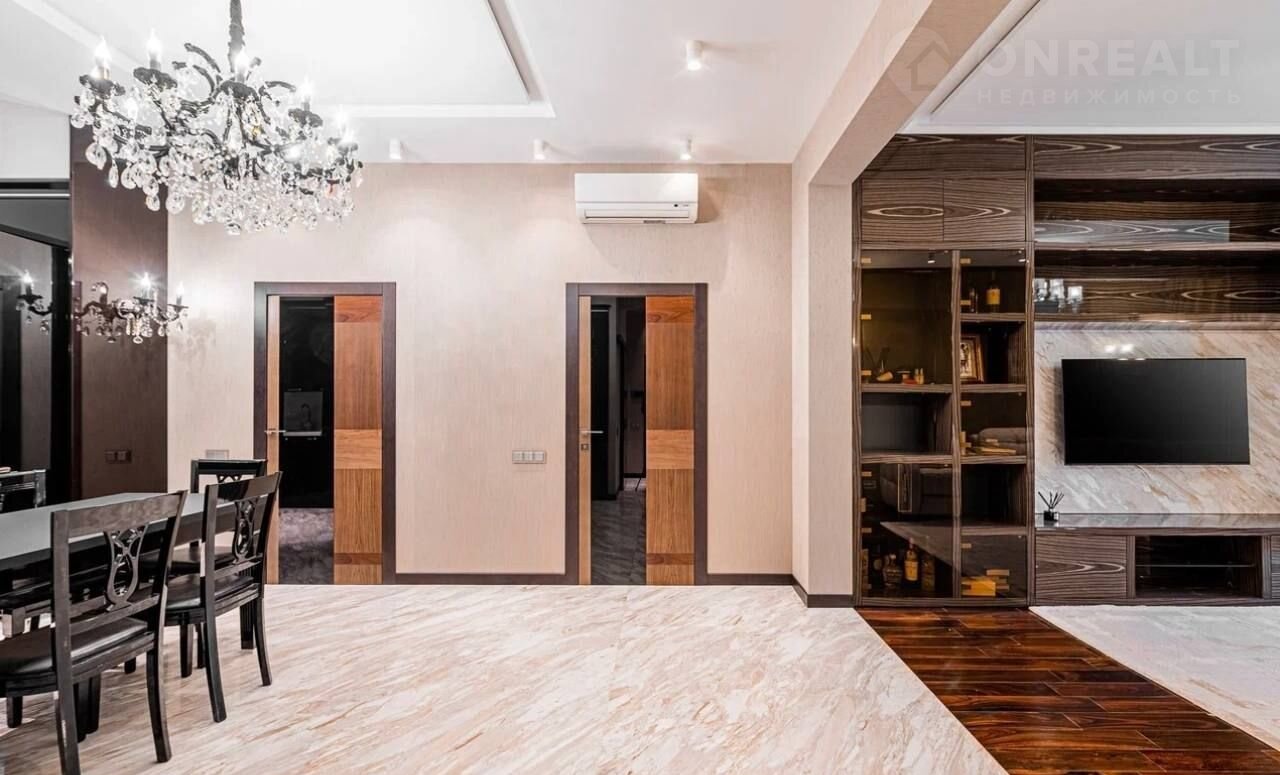 Квартира находится на среднем этаже. Выполнен качественный, дизайнерский ремонт. Планировка составляет 3 спальни и кухню гостиную.