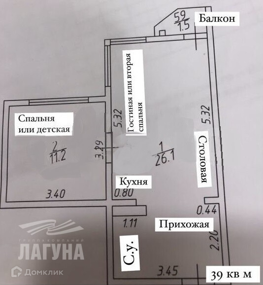 Общая площадь 39 м2
