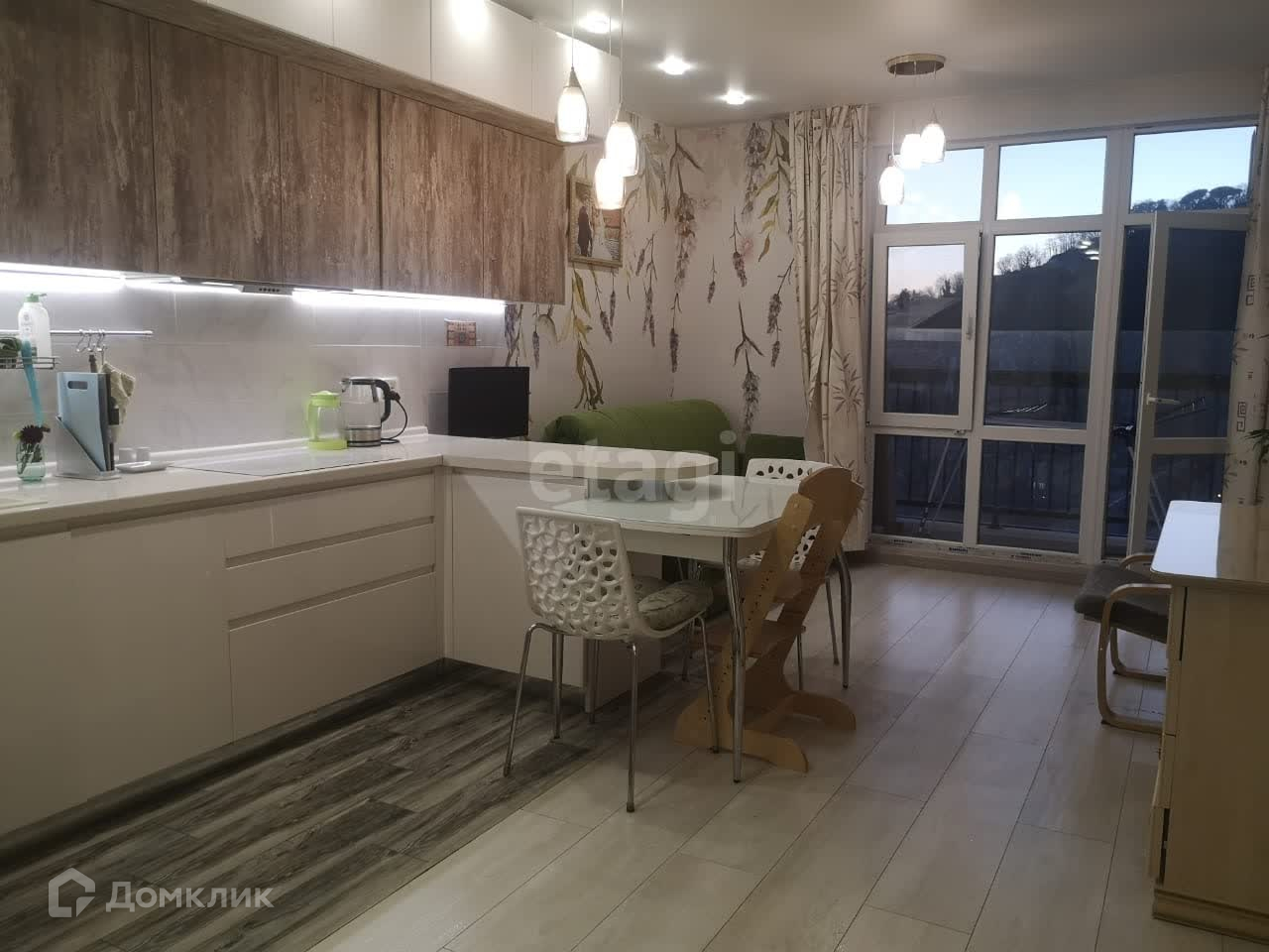 Квартира с современным ремонтом, продумано все до мелочей. С высокого 14 этажа открывается прекрасный вид на реку, горы и море.