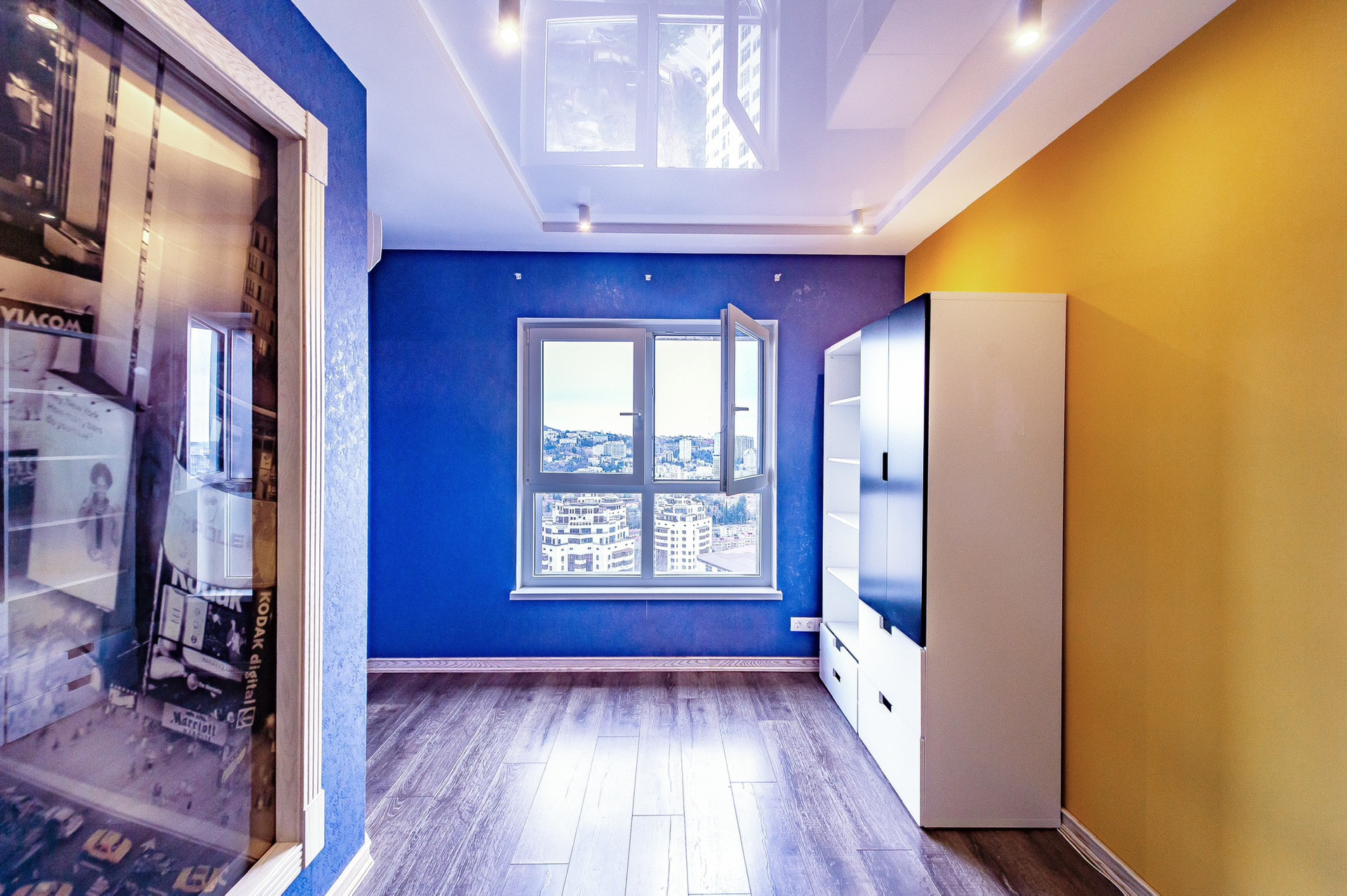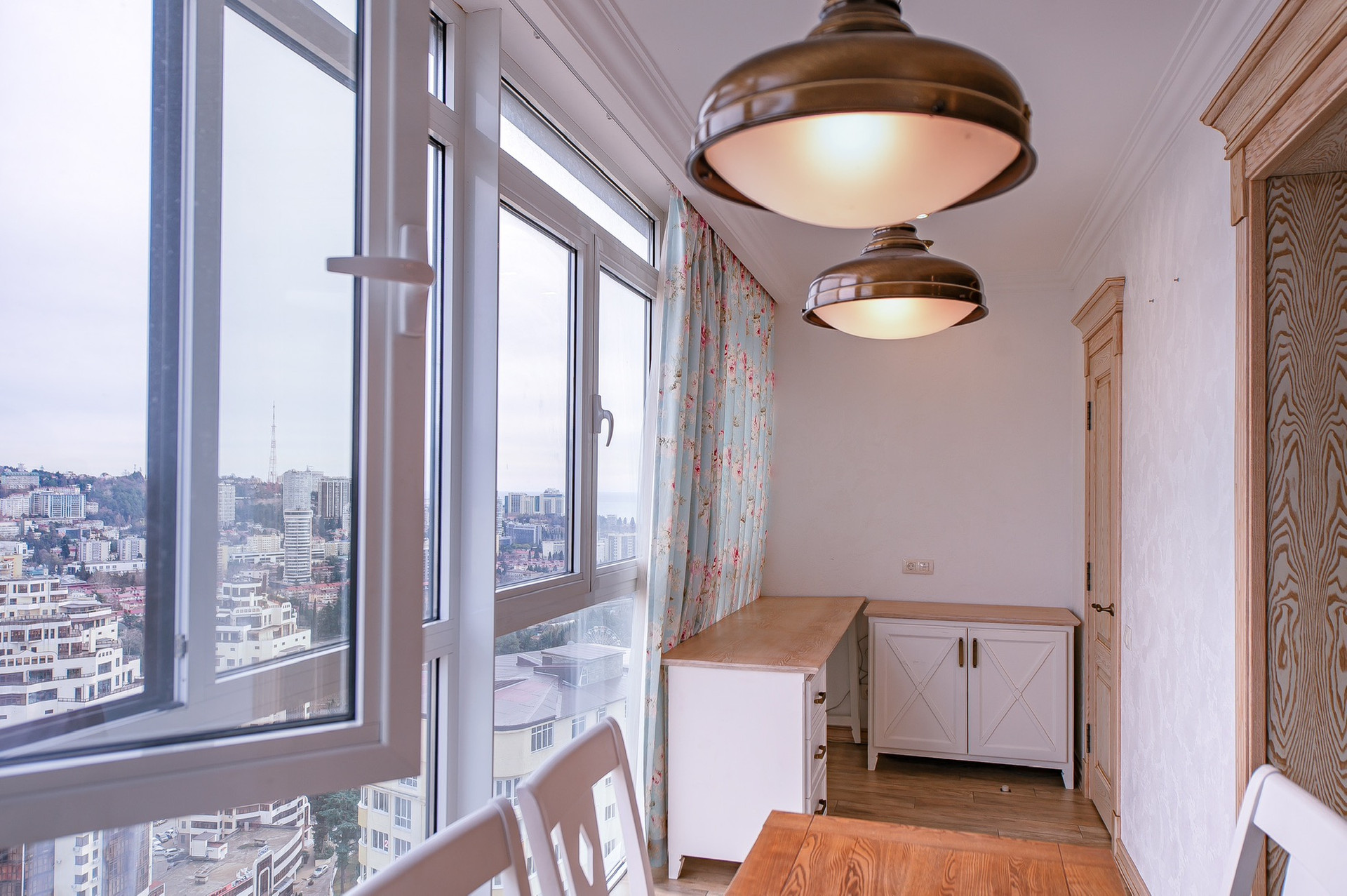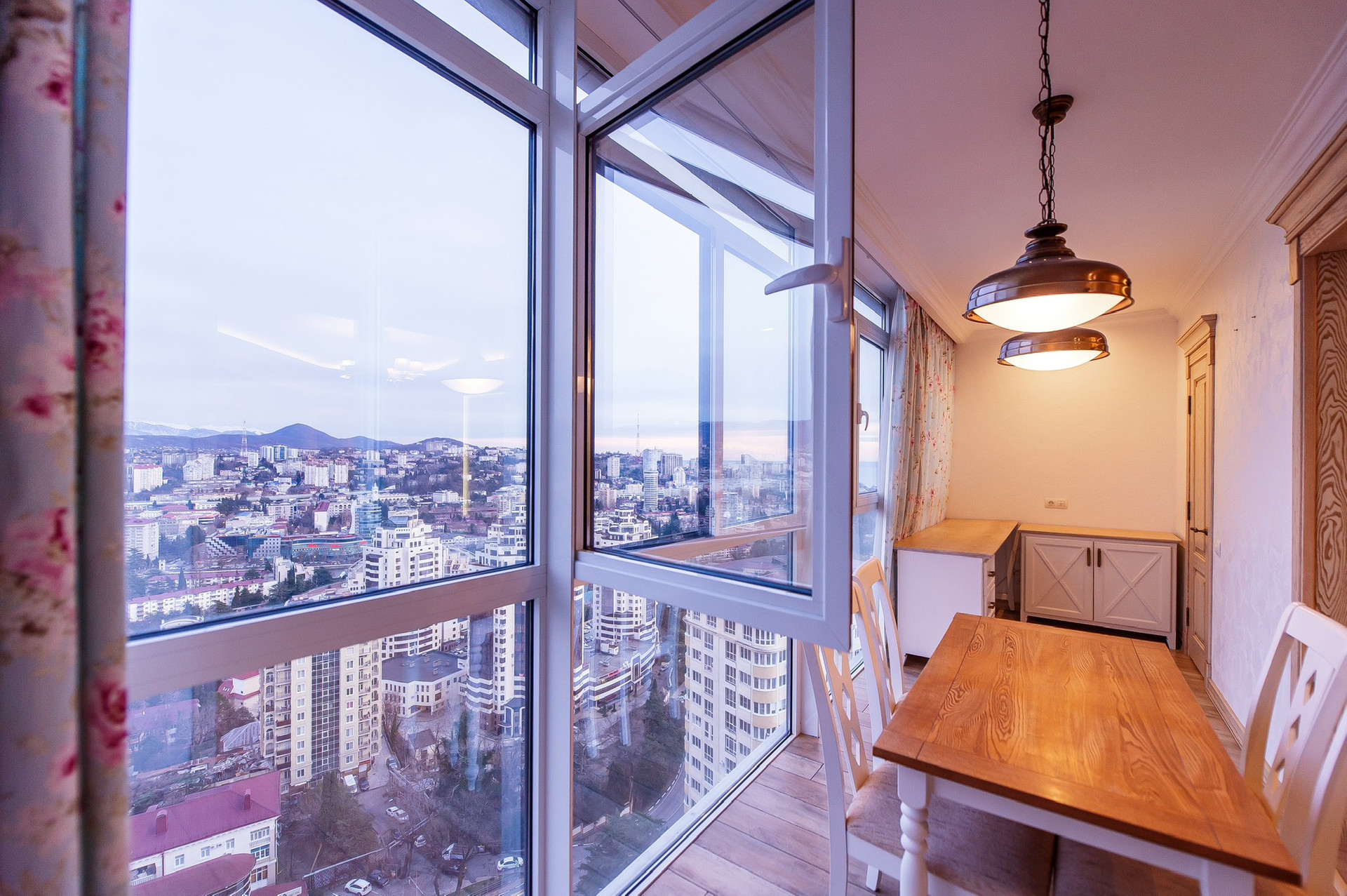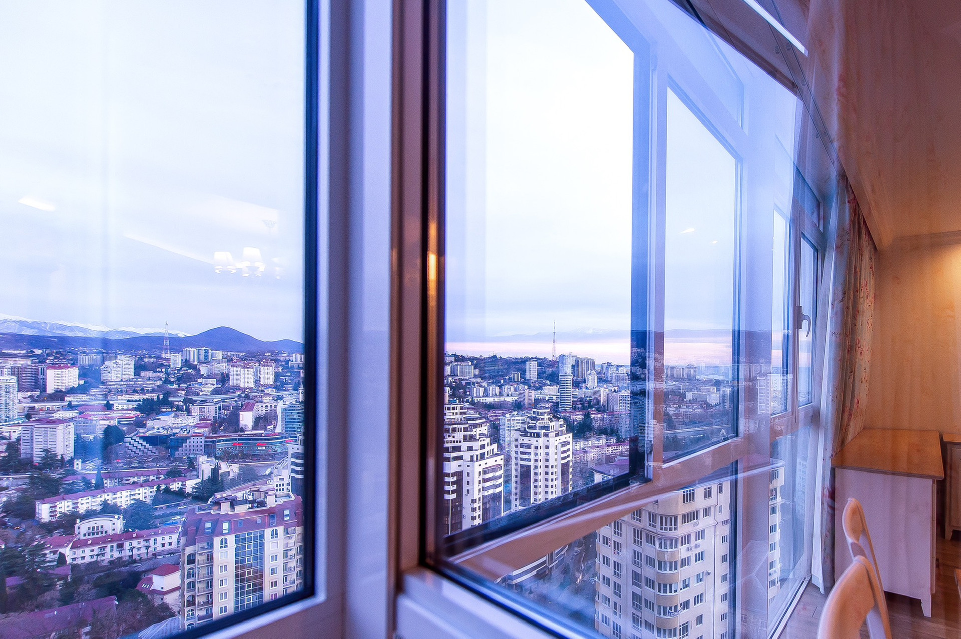 Витражные окна с великолепным видом на город, горы и море.