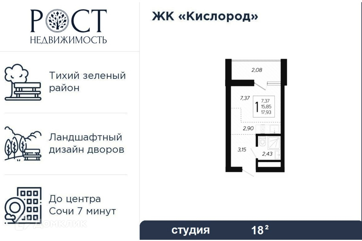 Квартира студия, 18 м2, этаж 2 / 19, на продажу в Сочи, жилой комплекс Кислород, 15