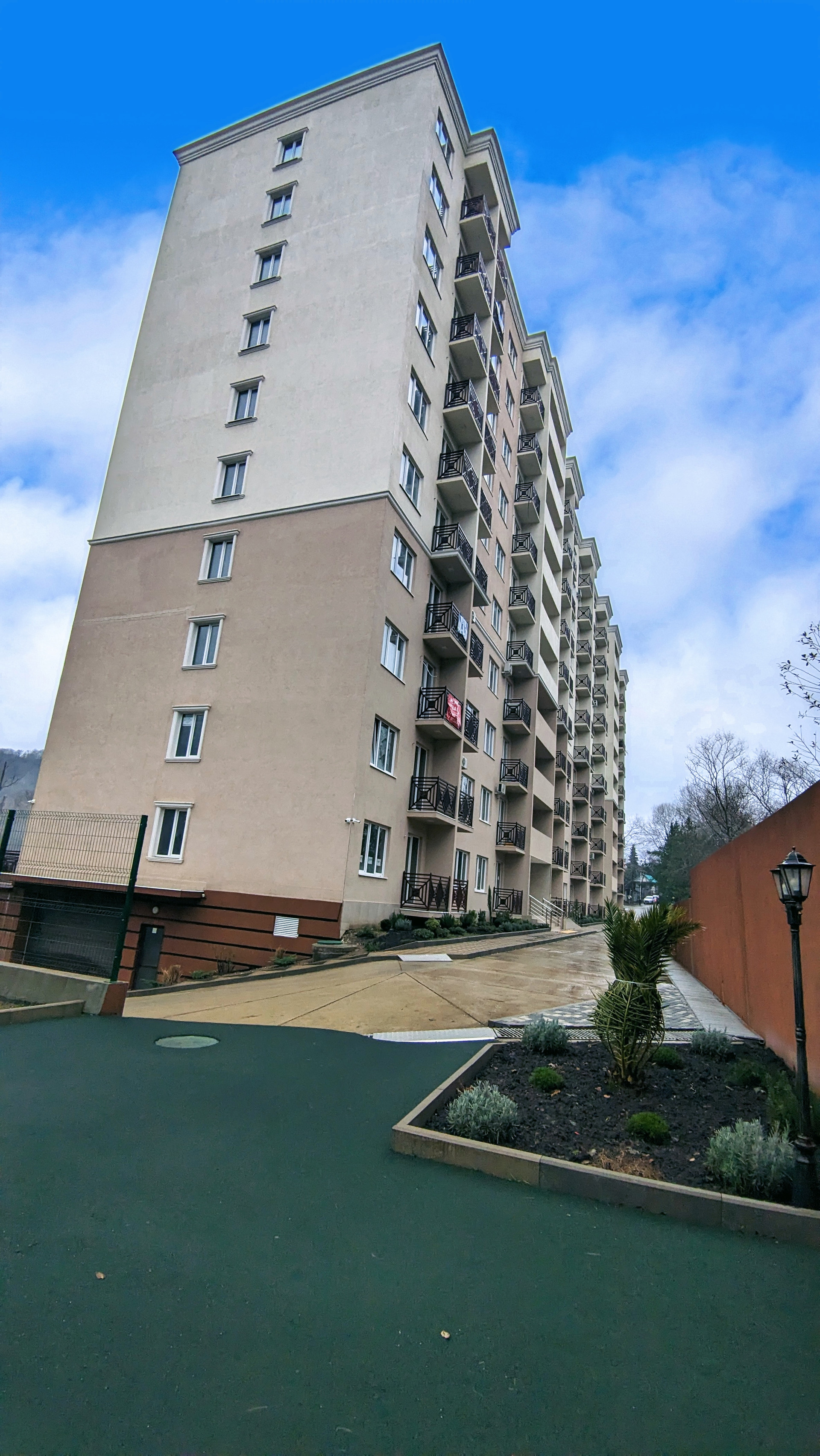 Монолитное здание,  огорожено и включает придомовую территорию с паркингом, детской площадкой и большой зоной отдыха с беседками и барбекю. Паркинг делится на подземный и гостевой у дома. Все центральные коммуникации подведены к дому: канализация, вода и электрика. В квартирах установлены счетчики. Также проведены интернет и кабельное TV.