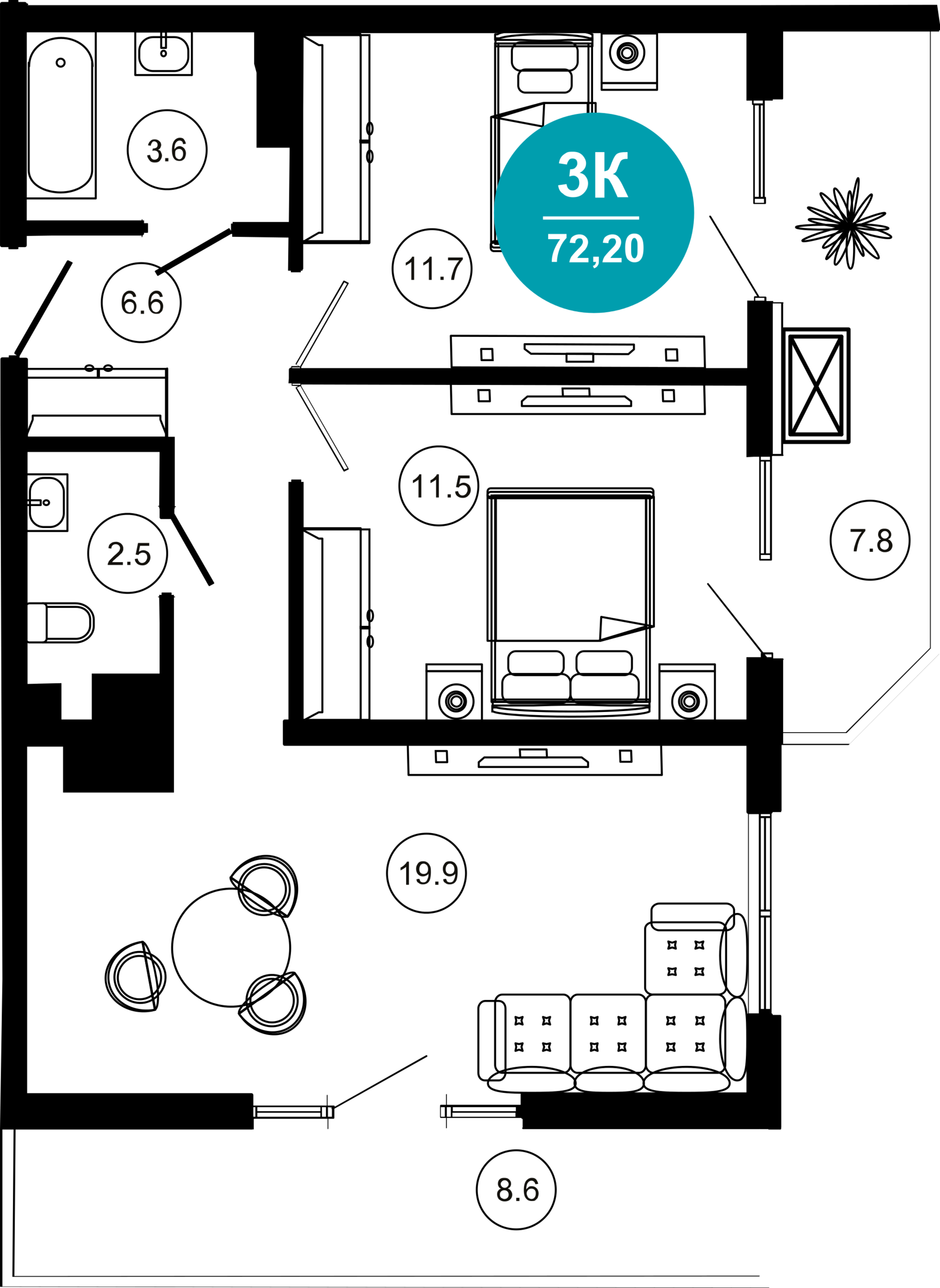• Планировка: 3-ком. (2 спальни + кухня-гостиная)
